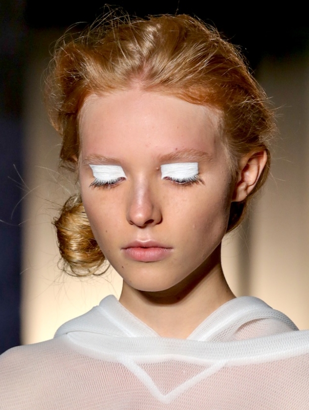 Но стрелки, как бы их ни рисовали, — это скорее классика, хотя экспериментов тоже было предостаточно. Если на показе Altuzarra по векам самым стандартным образом растушевали белые тени, которые подчеркнули яркость глаз и контрастность алой помады на губах, то для подиума MM6 Maison Martin Margiela девушкам "начертили" на веках белые прямоугольники кремовыми тенями.