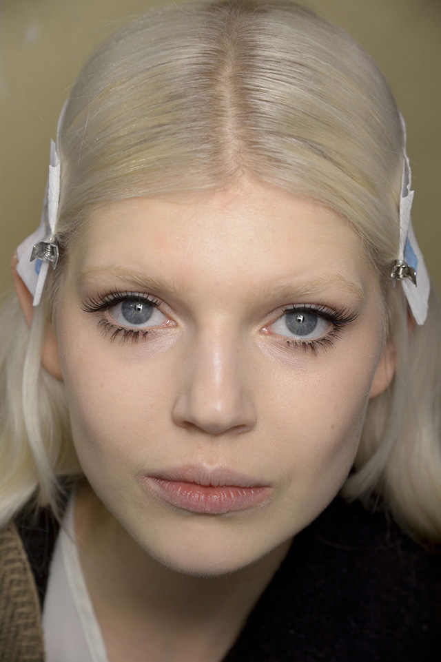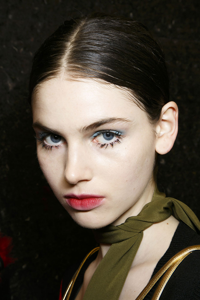 Prada предлагают свою версию взгляда 1960-х, "склеив" реснички наподобие лапок паучка и дополнив образ пастельно-голубыми тенями с размытым коралловым тинтом на губах. Визажисты показа Rochas демонстрируют тренд одновременно на верхних и нижних ресницах, поместив его на абсолютно "голое" лицо моделей, а Gucci ограничились гротескными нижними накладными ресницами, лишь слегка подчеркнув верхние черной тушью и линией подводки.