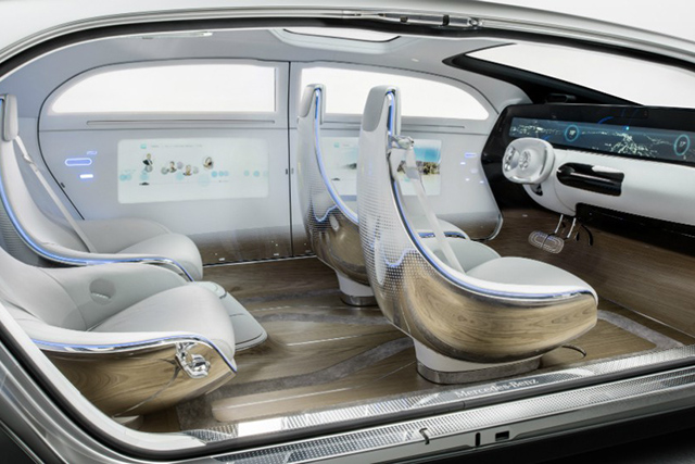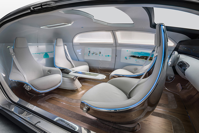 Итак, каково же будущее автомобильной промышленности по версии Mercedes-Benz? F 015 ездит сам, без обязательного участия в процессе водителя. Он может подавать сигналы и знаки пешеходам благодаря наличию шести LED-экранов. На эти же экраны транслируется информация о режиме работы автомобиля. Внутри просторного салона, похожего на салон космического корабля будущего из научно-фантастических фильмов, располагается четыре кресла, обтянутых белоснежной кожей наппа. Кресла можно развернуть как в два ряда, так и лицом друг к другу, и каждое из них, разумеется, регулируется в десятке режимов, чтобы сделать поездку максимально комфортной для самого капризного пассажира. Благодаря полированному до блеска алюминию, стеклянным поверхностям и вставкам из дерева салон выглядит особенно футуристично. Что касается внешнего вида машины, ее длина составляет 5,2 метра, а высота — всего полтора.