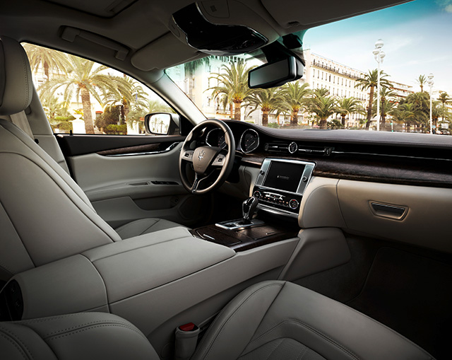 А теперь о главном: элегантные плавные линии как снаружи, так и внутри салона, сенсорный дисплей, часы на центральной консоли, которые кочуют из модели в модель, и фирменный трезубец Maserati, красующийся спереди на блестящей решетке.