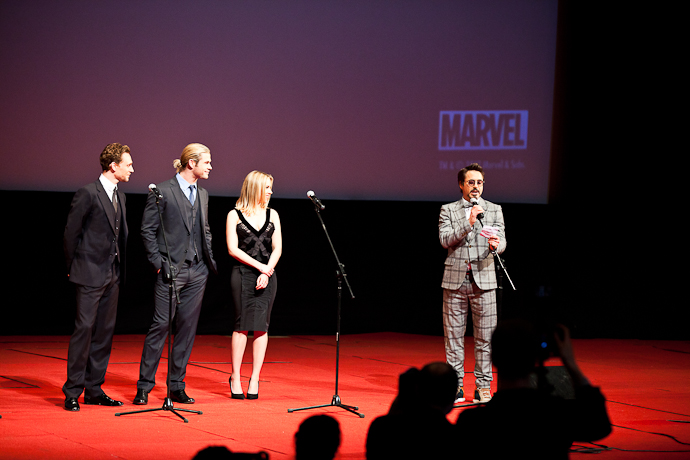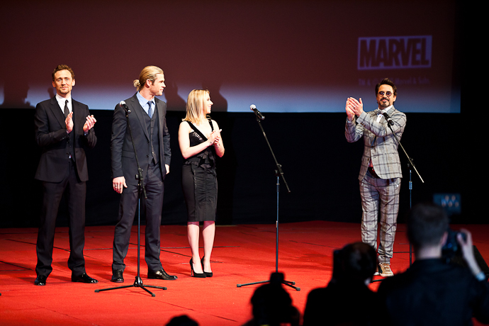 17 апреля в кинотеатре "Октябрь" состоялась премьера фильма "Мстители". На закрытый показ в Москву прибыли исполнители главных ролей, звезды первой величины Роберт Дауни-мл., Скарлетт Йоханссон, Марк Руффало, Крис Хемсворт, Джереми Реннер и Том Хиддлстон.