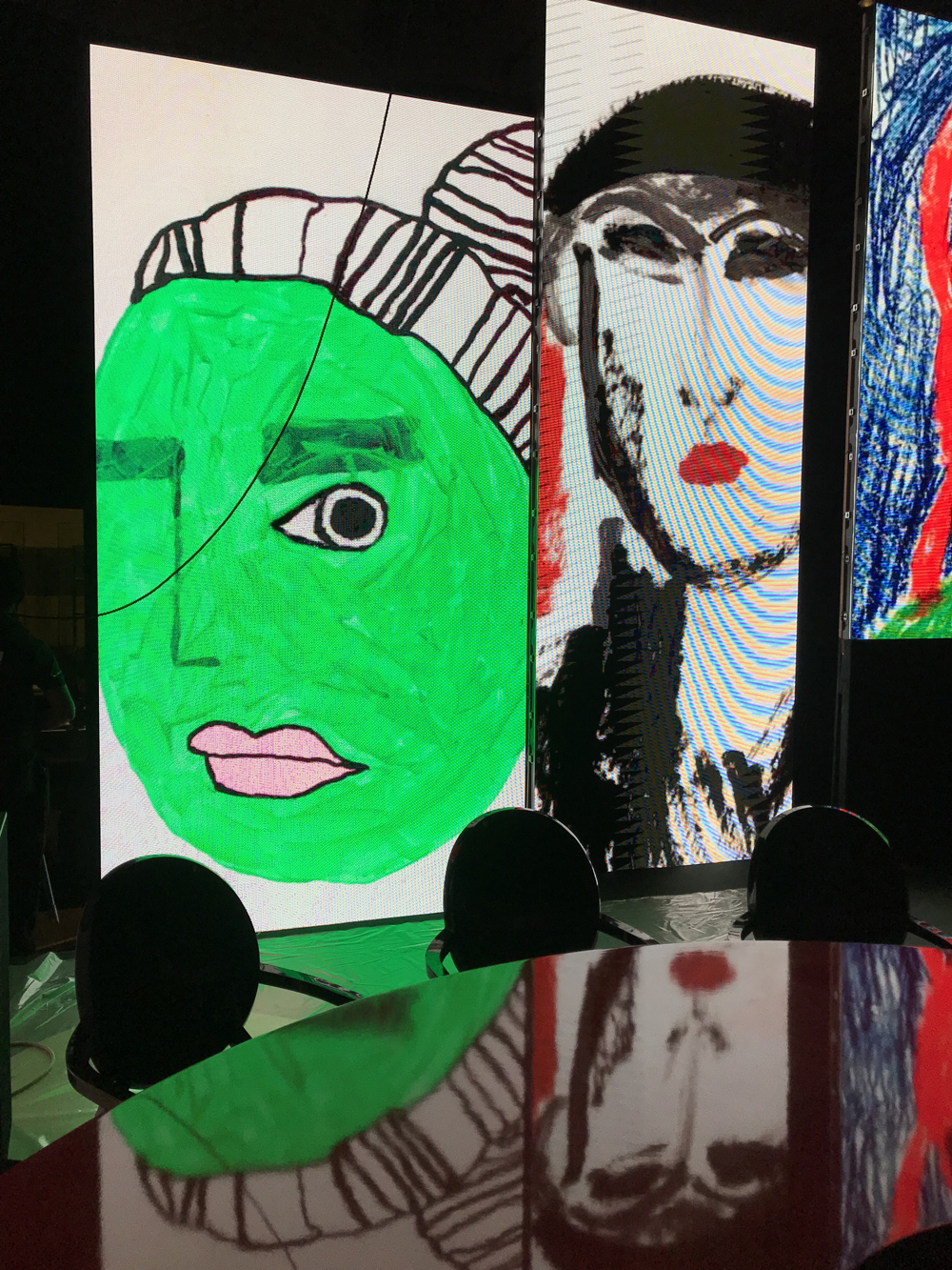 Для видеоконтента использовались работы молодых художников с особенностями развития - Маркуса Мартиновича, Мариам Алакбари и других художников, поддерживаемых фондом «Антон Тут Рядом».