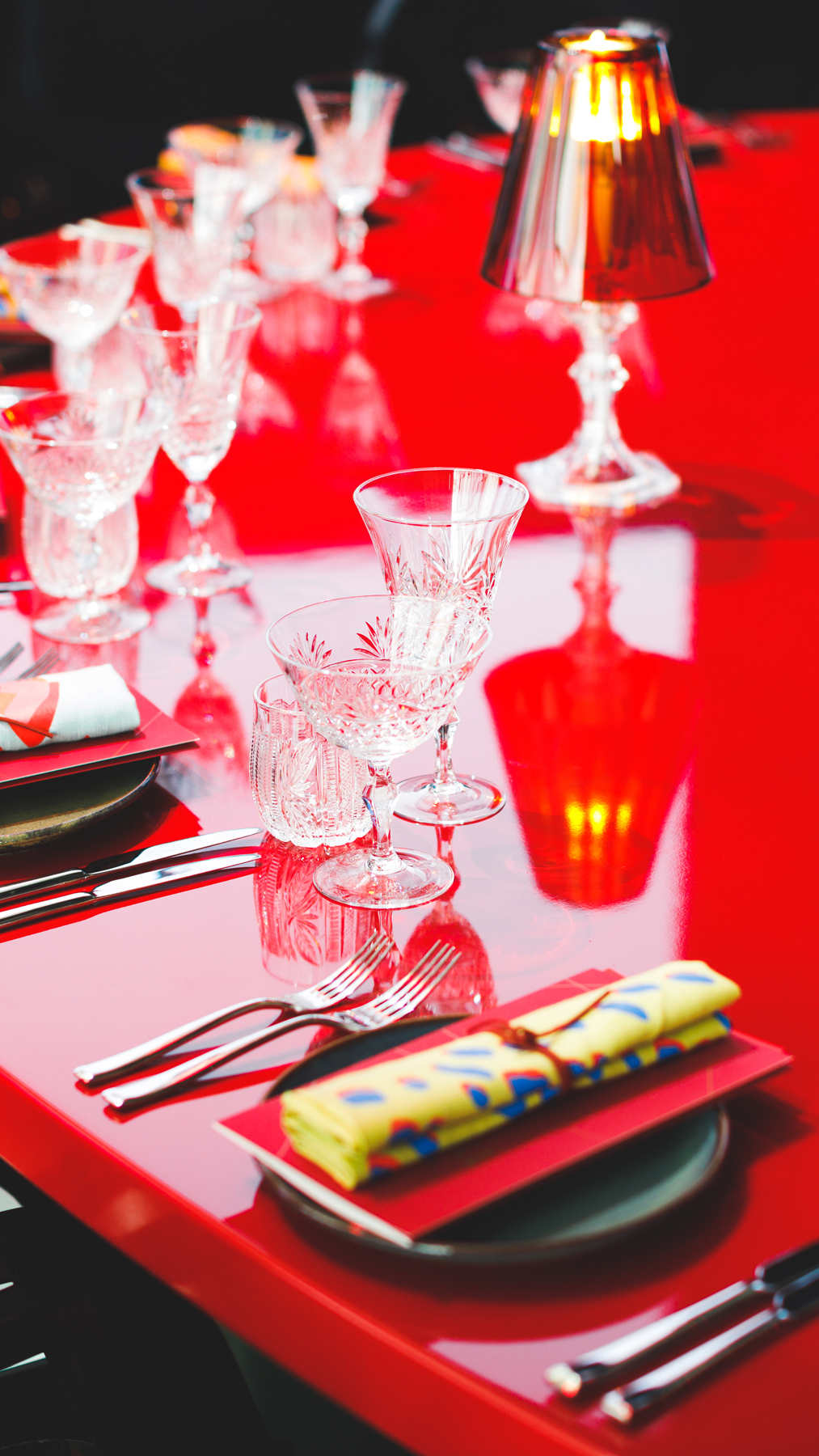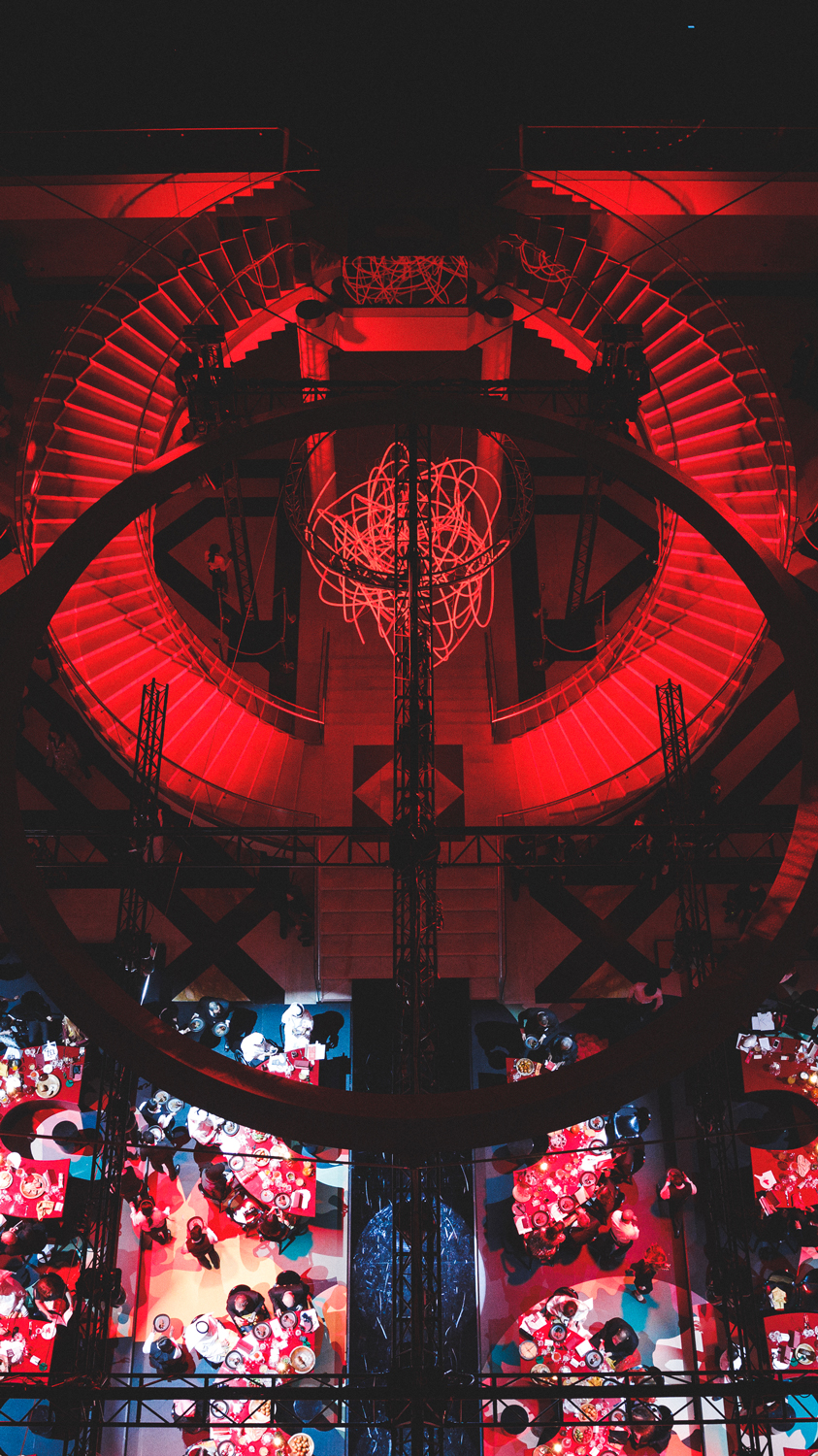 Для благотворительного гала-ужина были изготовлены столы специальной формы с глянцевым покрытием цвета blood red, дизайн которых разработало бюро VISIONÄR.