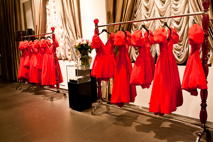 Но при этом в бутике почти не было свободного места: дверь открывалась и в магазине появлялись новые лица, которые сразу, что называется, с корабля на бал, направлялись в корнер Ульяны — посмотреть на эксклюзивные платья Natalia, созданные Ульяной и Наташей Водяновой для благотворительного фонда "Обнаженные сердца". Найти их было совсем нетрудно: они заняли несколько вешалок. Платьев огненно-красного цвета с рукавами-фонариками и пышной юбкой изготовили всего 20, причем разной длины: макси, миди и мини. В самом коротком в бутик пришла сама Наташа Водянова.