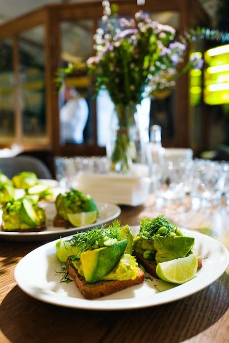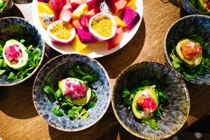 Для гостей презентации приготовили гречневую кашу на кокосовом молоке с вареньем из инжира, миксом семечек и орехов, а также тост с авокадо, бобами эдамаме, лаймом и зеленью на безглютеновом хлебе — vegan-блюда из нового меню. Из основного меню ресторана были предложены хрустящие ломтики авокадо в темпуре с нежным хумусом и эдамаме и жареное авокадо с крабом, яйцом пашот и соусом «Олландез».