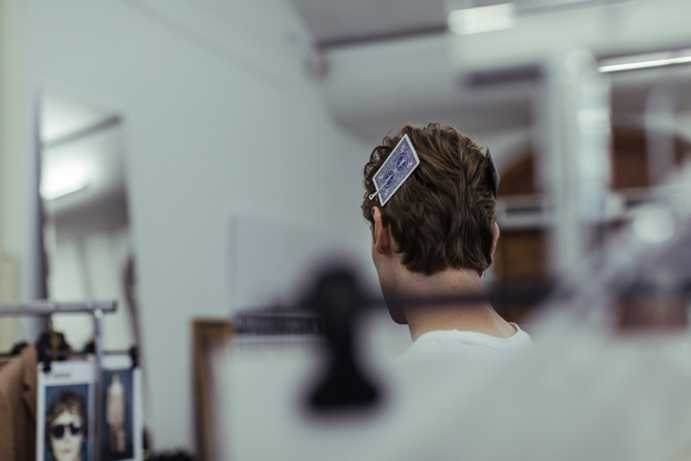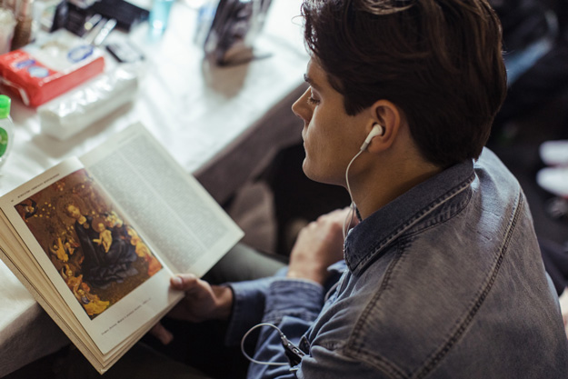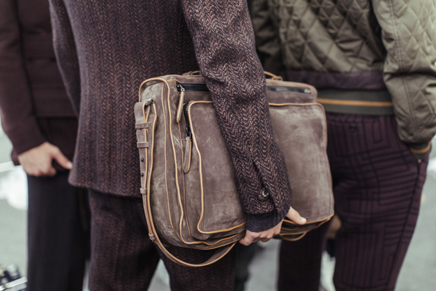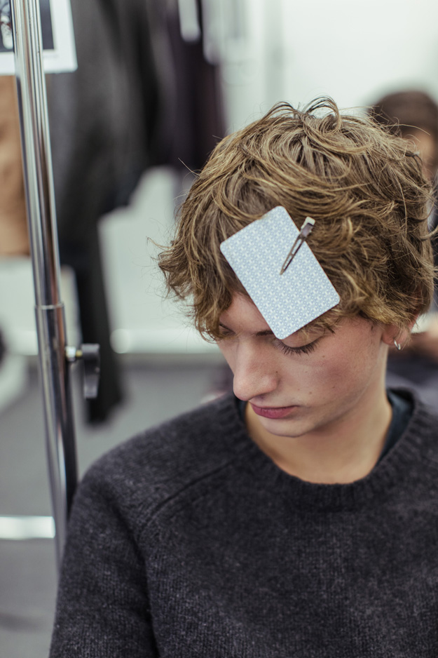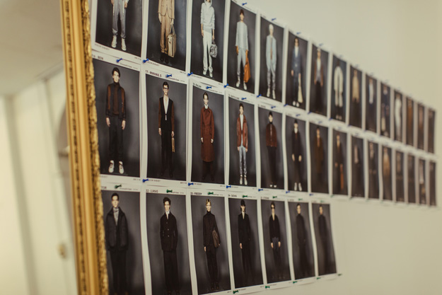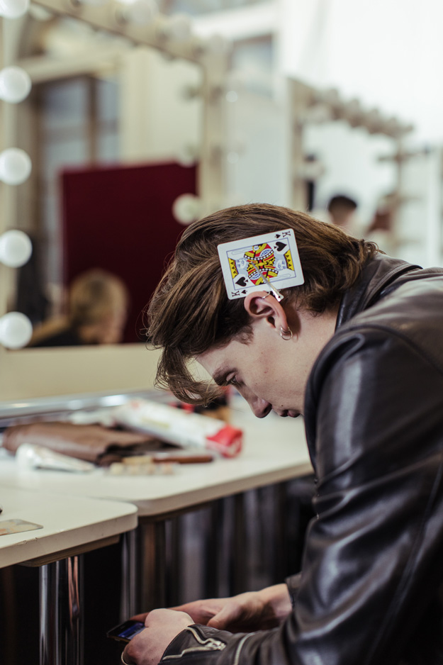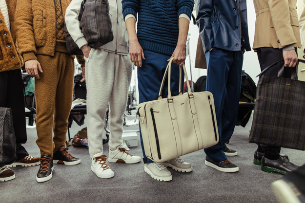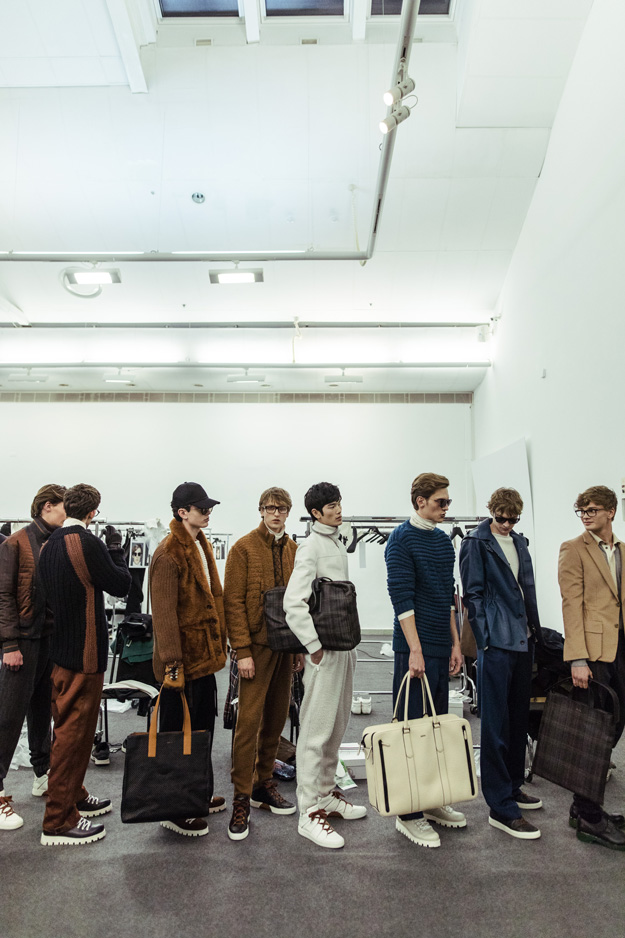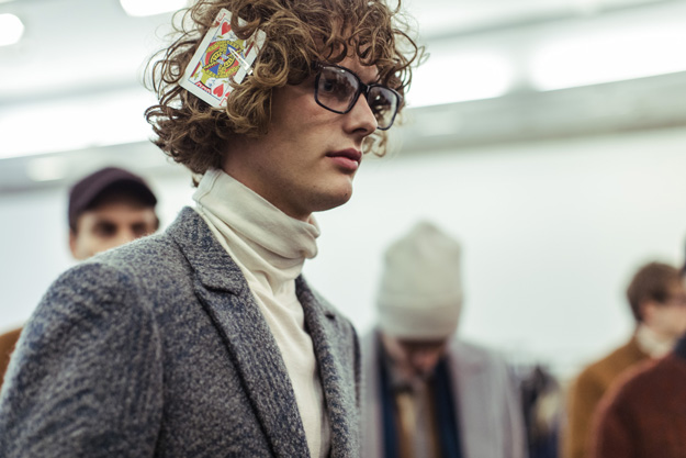 На бэкстейдже модели с игральными картами в волосах читают классические книги, примеряют шерстяные пальто и кашемировые свитера, солнечные очки, кожаные рюкзаки, портфели и дорожные сумки. Все вещи доступны в обновленном бутике бренда в Третьяковском проезде.
