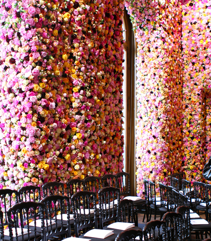 В принципе было очевидно, что долгожданный дебют Рафа Симонса в Dior вызовет сильный интерес у публики, однако такого собрания звездных тел давно не было видно ни на одном парижском показе. Тонированные авто гостей подъезжали непосредственно ко входу, не оставляя зевакам и блогерам шанса сфотографировать пассажиров. Внутри wow-эффект был достигнут с помощью вертикальных цветочных садов, из которых были сделаны стены всех четырех залов, где проходило дефиле. Надо было видеть лица приглашенных в момент, когда они вступали в "цветочную комнату", понимая что все фиалки и орхидеи настоящие! Мощная энергетика живых цветов задала правильный тон показу — все ждали нового начала, новой вехи в истории легендарного французского дома.