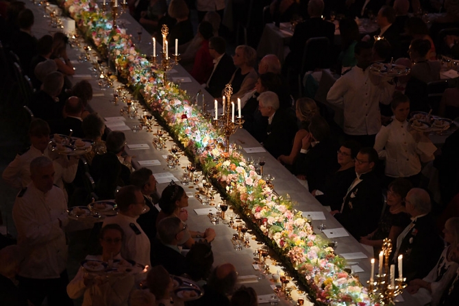 10 декабря в стокгольмской ратуше состоялся традиционный банкет, посвященный лауреатам Нобелевской премии. В застолье, кроме обладателей премии этого года, приняли участие 1300 человек, включая членов королевской семьи и членов правительства.