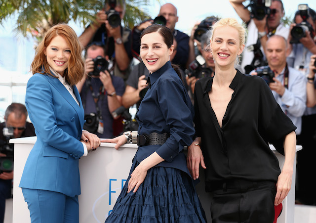 Гаспар Ульель, Жереми Ренье и Леа Сейду на фотоколле драмы Бертрана Бонелло "Сен-Лоран"
