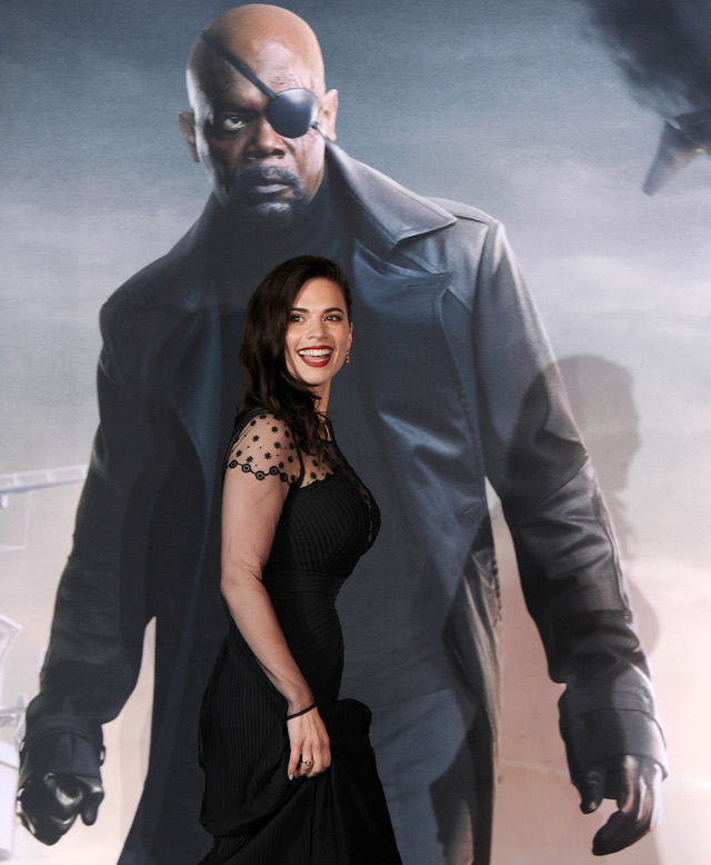 Актриса, слухи о беременности которой появились на днях в издании People, правда, без ссылки на источник информации, появилась на красной дорожке перед кинотеатром El Capitan Theatre в белой блузке и черной юбке с вышивкой Giorgio Armani Privé. Компанию Скарлетт составили партнеры по фильму Сэмюэл Л. Джексон, Коби Смолдерс, Хейли Этвелл, а также сам Капитан Америка — Крис Эванс.