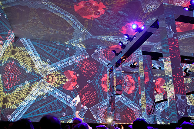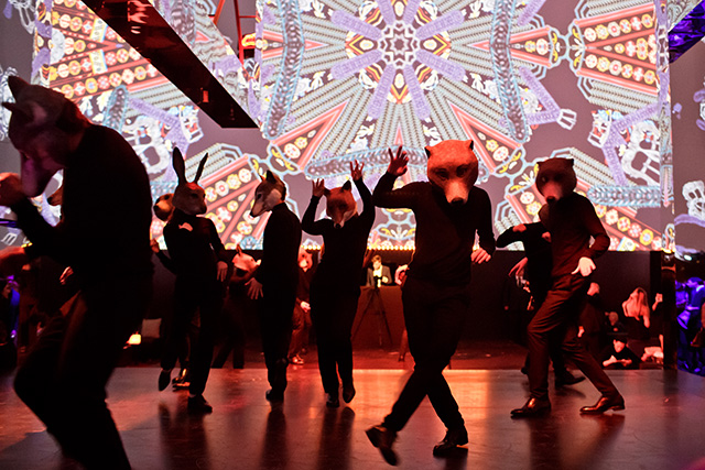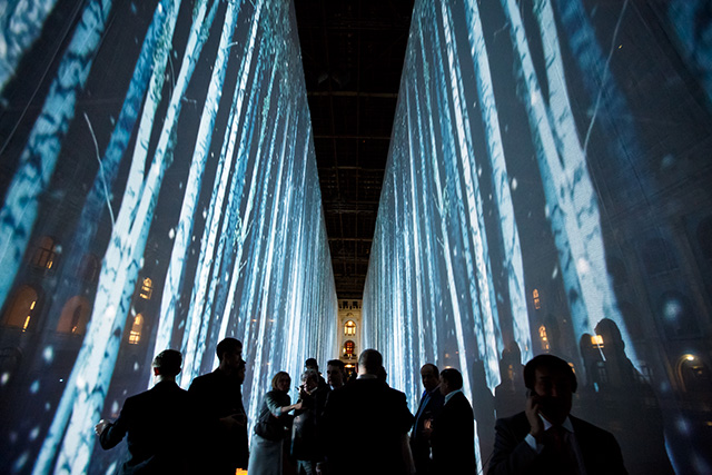 После беглого знакомства с обновленным бутиком на 3-й линии ГУМа друзья и почитатели французского бренда переместились в Гостиный двор, где и развернулась содержательная, красивейшая часть вечера. Уже с порога становилось понятно: равнодушным никто не останется. Первое, что видели все приглашенные, — световая инсталляция. 11-ти метров высотой, она выстраивалась в длинный коридор, напоминавший березовый лес, по которому гости попадали в другое сказочное пространство. А по дороге им встречались медведи, волки и другие лесные жители — вернее, модели со звериными головами, — они приветствовали гостей и провожали в главный зал.