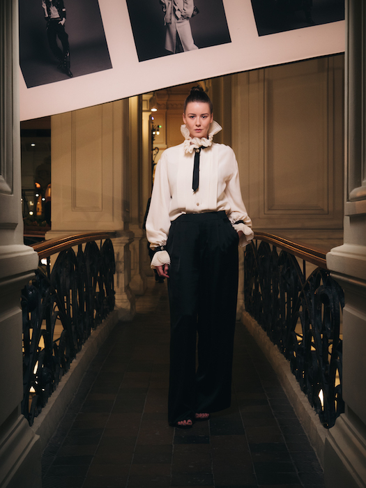 Сама коллекция, созданная Виржини Виар, посвящена любви и романтике, а ее доминирующими цветами, помимо белого и черного, стали бледно-зеленый и розовый. Легендарный костюм бренда в этот раз интерпретирован под форму для верховой езды.