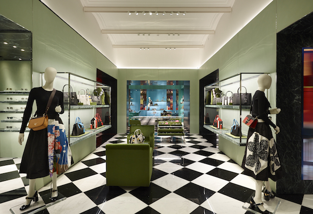 На двух этажах бутика, площадью 670 кв. м, расположились женская и мужская коллекции, а на второй линии второго этажа ГУМа, через мостик от магазина обосновался отдельный бутик Prada с женской обувью.