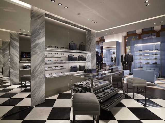 В интерьере бутика решено было сохранить оригинальный сводчатый потолок исторического универмага, в сочетании со стеклом в фирменных зеленых тонах бренда. Особое внимание декораторы уделили деталям, что подчеркнуло отличительные черты самого бренда: элегантность, изысканность, эффектность.