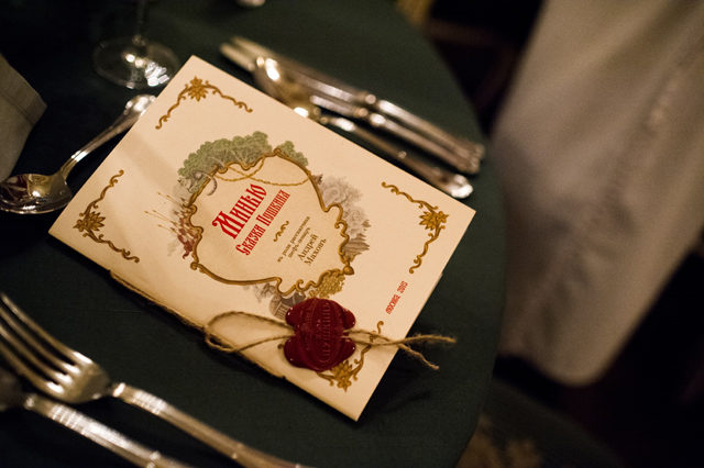 «Мед пенный», «Полба и хлебное вино», «Шамаханские яства и гранатовый сок», «Уха рыбака и хреновуха», «Медведь и можжевеловая настойка», «Конфекта и французское шампанское» друг за другом переносили гостей на страницы поэмы о Руслане и Людмиле, сказок о попе и работнике его Балде, золотом петушке, рыбаке и рыбке, медведихе и царе Салтане. Андрей Махов дополнял каждое блюдо собственным рассказом. А Евгений Миронов, который играет ту же роль в спектакле «Сказки Пушкина», на этот раз оказался в числе приглашенных гостей. Компанию актеру за его столом составили Константин Эрнст и Ингеборга Дапкунайте. На ужине также присутствовали Максим Виторган, Дина Силина, Дарья Веледеева и другие.
