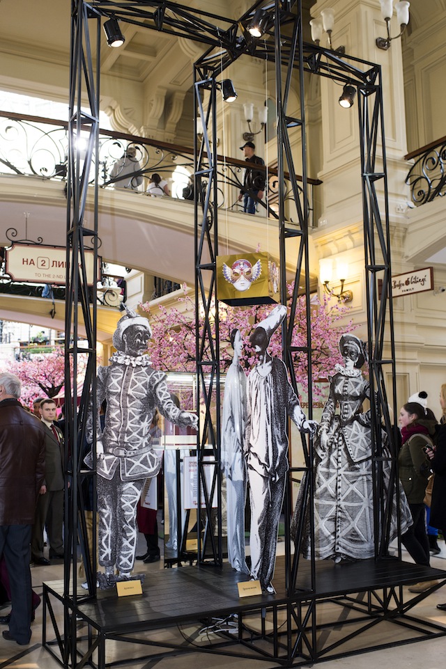 Теперь, прогуливаясь от магазина к магазину, посетители видят фигуры Валерия Гергиева, Дмитрия Крымова, Евгения Каменьковича, Константина Хабенского, Кирилла Серебренникова и еще нескольких десятков режиссеров и актеров. Их черно-белые фотографии в полный рост окружены снимками занавесов известнейших российских театров. Эту выставку в сотрудничестве с театральным музеем имени Бахрушина и "Черешневым лесом" создали театральный фотограф Александр Иванишин и театральный художник Александр Боровский.
