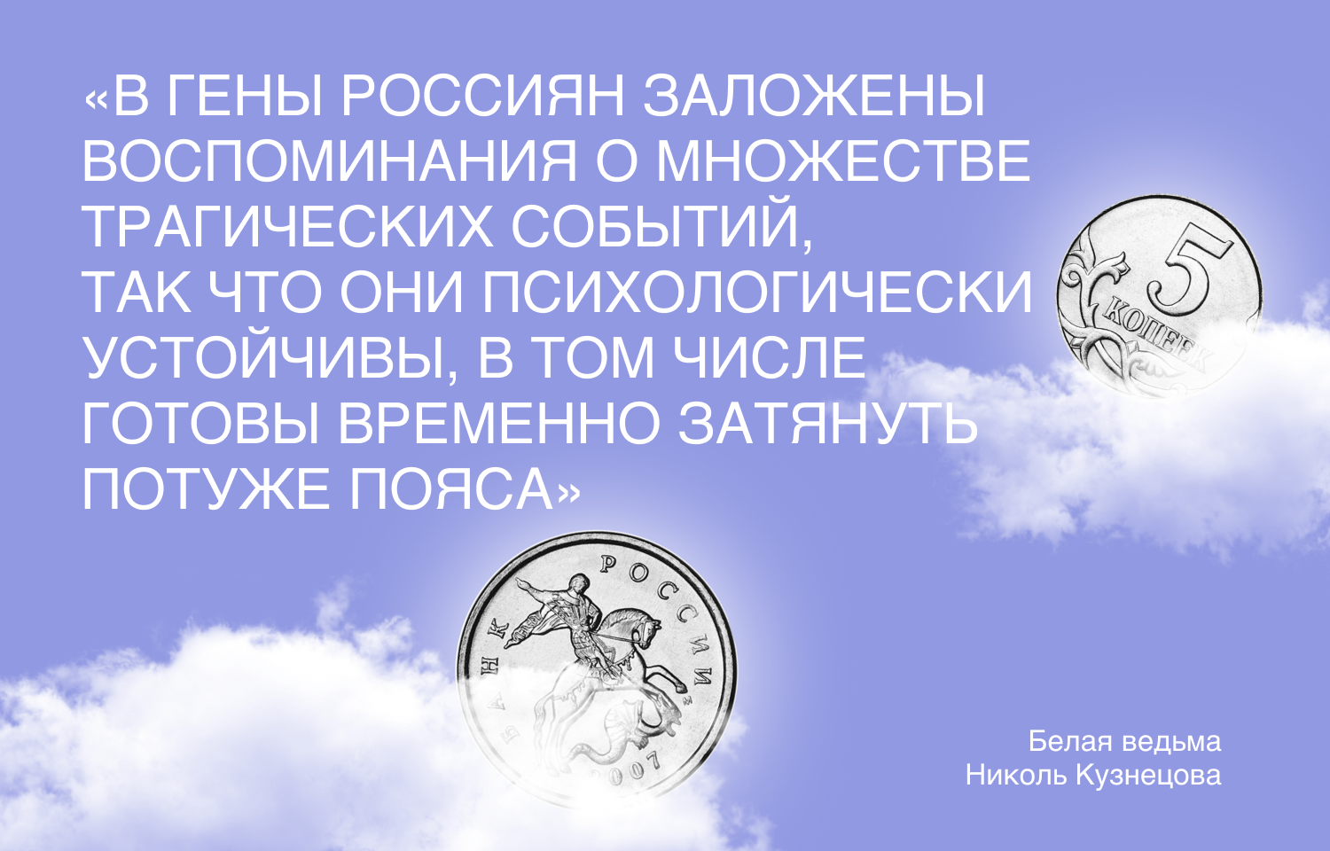 «В гены россиян заложены воспоминания о множестве трагических событий, так что они психологически устойчивы, в том числе готовы временно затянуть потуже пояса. Никаких политических детонаций от коронавируса в стране не предвидится. Вся энергия народа пойдет на возрождение благосостояния».