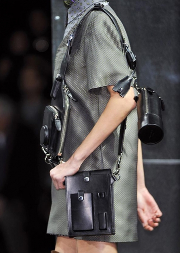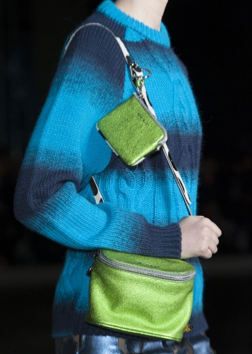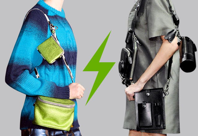 Александр Ванг представил милитари-вариант такой сумки: это военный планшет, футляр для фотоаппарата и загадочный цилиндр — не хватает только отделений для патронов. Хотя обладателя этого предмета и без того можно принять за военного, как минимум, журналиста. А Генри Холланд из House of Holland соединил вместе несколько блестящих зеленых сумочек, кошелек и косметичку, связав их белым ремешком в черный горошек, — девочкам понравится!