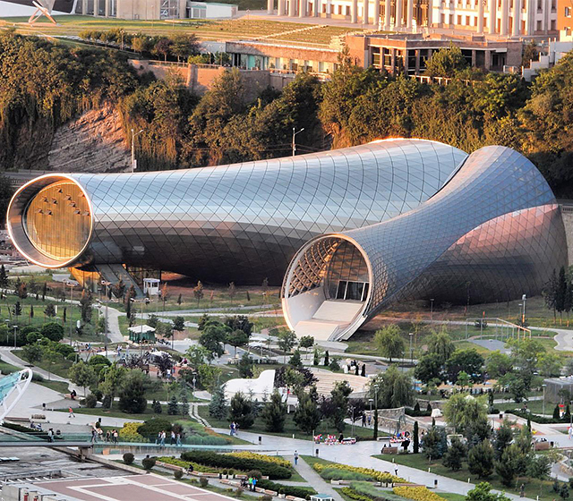 Перед авторами проекта – итальянской студией Fuksas – стояла задача не испортить исторический ансамбль Старого Тбилиси, об успешности чего мы не беремся судить. Однако то, что здание получилось заметными и выдающимся — бесспорный факт. Футуристический перископ (больше похожий на инопланетянина) под своими двумя крышами объединил музыкальный театр, готовый принять 550 гостей, и выставочный зал площадью 2 000 квадратных метров.