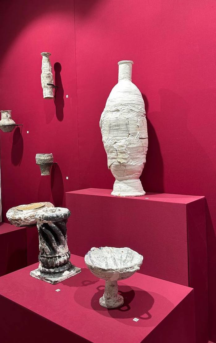 У Jessica Gallery стенд-шедевр, очень классная игра со временем. Такое сочетание классического музейного пространства, строгого красного фона, кубов-постаментов, белых французских штор. И в этой обстановке были представлены современные арт-объекты, напоминающие античные вазы.