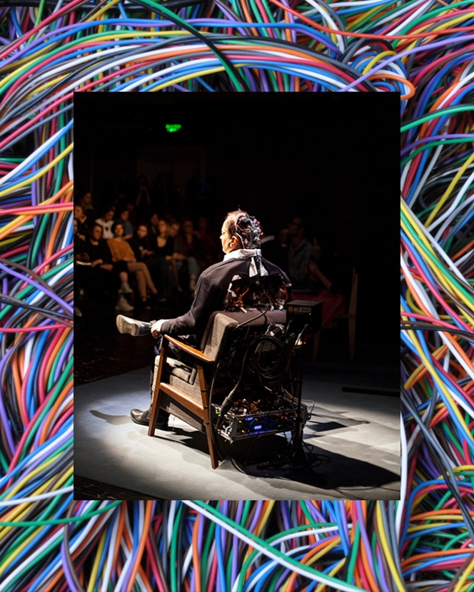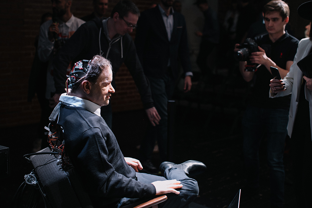 И всё-таки, настаивает Мелле, граница между людьми и машинами не такая уж чёткая. Во-первых, они дают гибриды: на экране живой писатель встречается с неслышащим учёным, у которого в голове есть чип, заменяющий природный слух (главный плюс такого аппарата, по мнению докладчика, — возможность этот слух включать и выключать). А во-вторых, почему мы так уверены, что мы не роботы изначально только потому, что умеем вводить капчу? Взять хоть премьерный вечер: почему мы аплодируем в конце спектакля, если аплодировать некому? Разве это не работа программы?