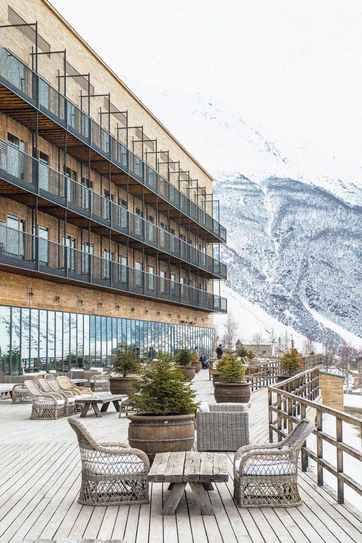 Главная достопримечательность этих мест — гора Казбек, одна из самых высоких в Грузии и на всем Кавказском хребте. По всей длине здания проходит терраса, с которой открывается панорамный вид на зеленые луга и холмы. Деревянные панели на фасаде здания связывают современное здание с окружающими его лесами. Благодаря окнам во всю стену в фойе и номерах отеля пространство наполняется светом. В отделке используются только природные материалы, а в оформлении интерьеров — современная и винтажная мебель, дизайнерские аксессуары и антиквариат. Кухня ресторана соответствует грузинским кулинарным традициям, а блюда готовят из натуральных продуктов, выращенных неподалеку. Шефы ресторана проводят кулинарные мастер-классы и семинары, на занятиях учат использовать традиционные грузинские травы, овощи и специи, а также делятся старыми рецептами.