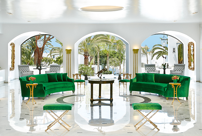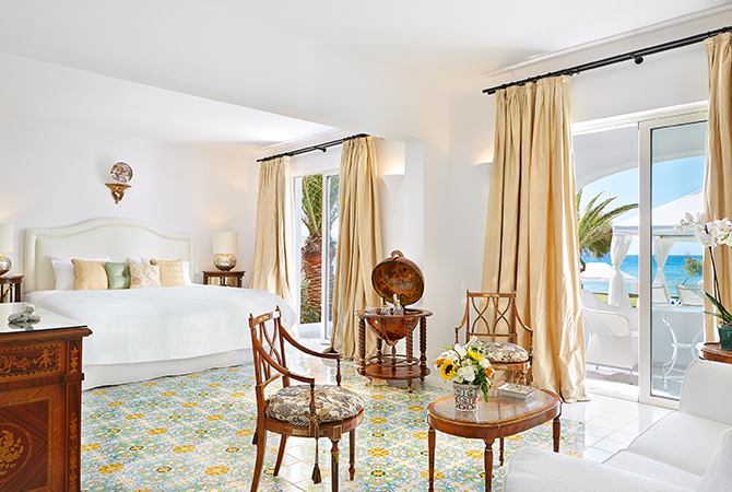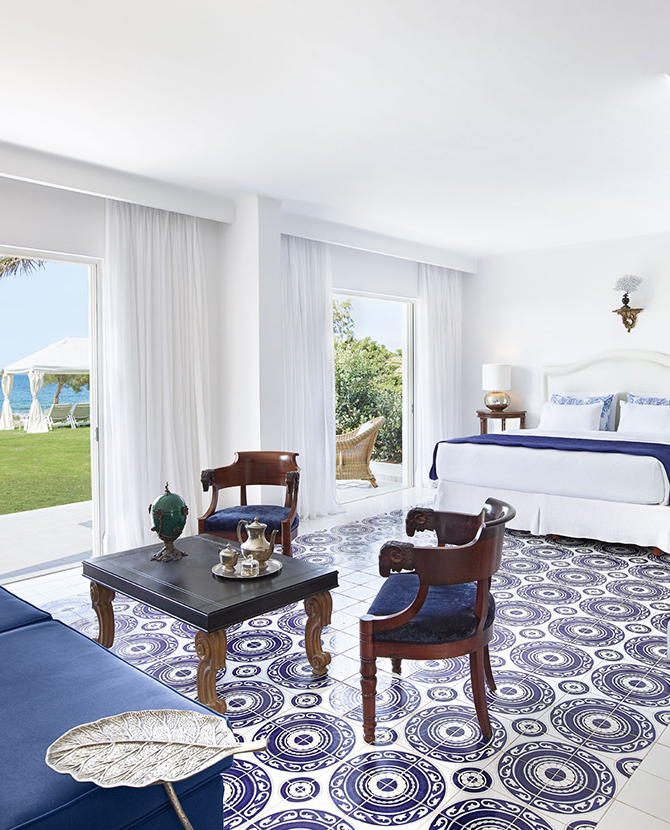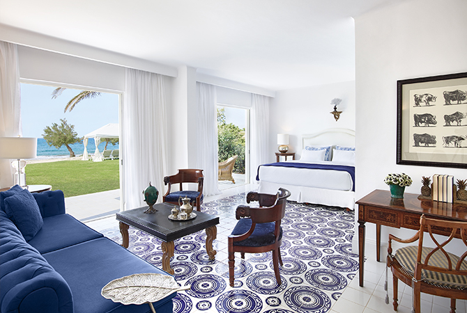 В отеле 69 сьютов и вилл: в основном здании — номера с большой террасой с джакузи и видом на море, семейные номера с раздельными спальнями и всем необходимым для комфортного проживания с детьми. В каждом номере индивидуальный дизайн, в интерьерах которых используется антикварная и современная мебель, а пол украшен плиткой ручной работы в цветах греческих островов: синего и белого с оттенками розовой бугенвиллии и золотого цвета подсолнечника.