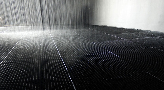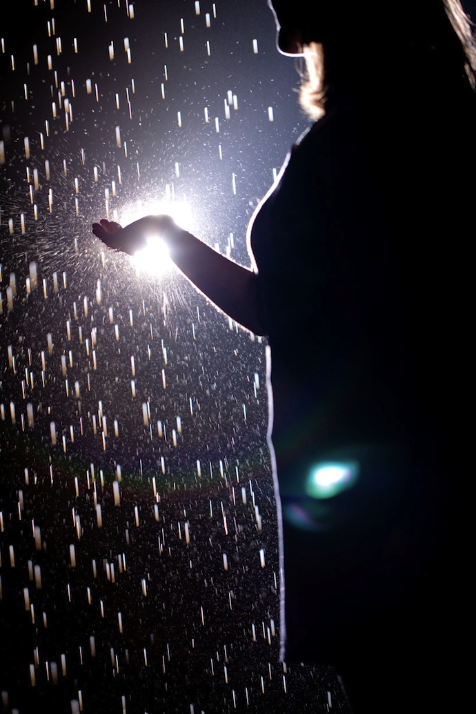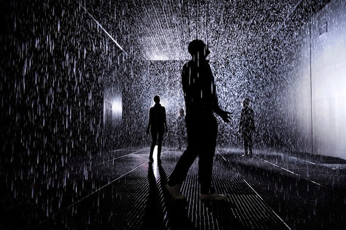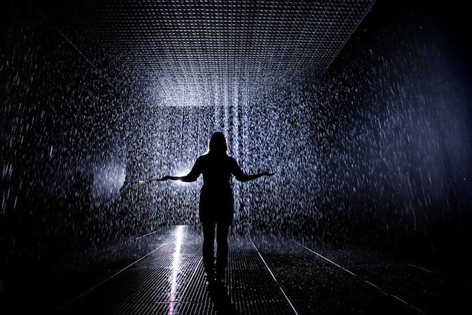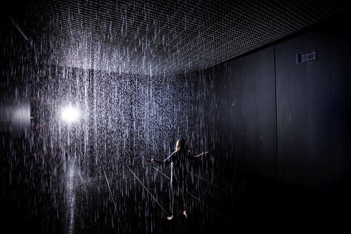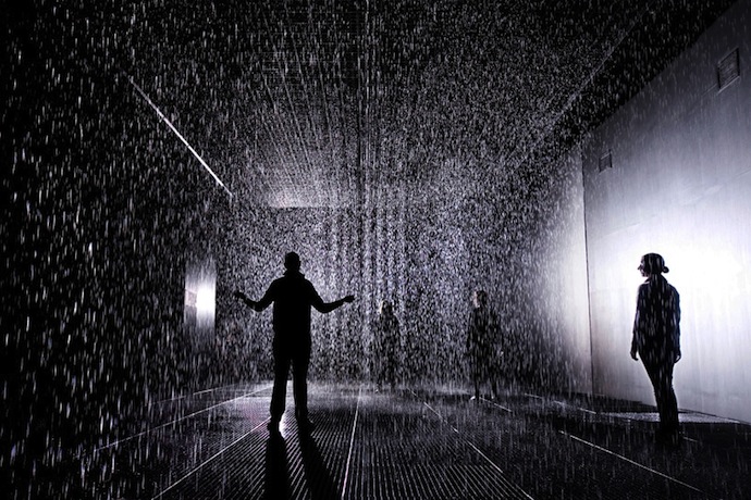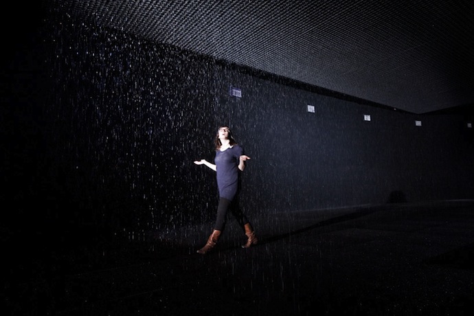 Выйти сухим из комнаты, где стеной льет дождь? Теперь это возможно в лондонском центре искусств Барбикан (Barbicane Centre). Британские художники из студии rAndom international приглашают всех желающих узнать, как контролировать ливень. Проверить это можно, доверившись сложной, регулирующей потоки воды системе или посмотрев на других, более смелых посетителей. Под звуки барабанов и шум дождя вы следуете по темной комнате. Оборудование работает по-настоящему виртуозно: ливень останавливается четко над вашей головой, стоит лишь сделать шаг. Достигается это с помощью нескольких камер, которые фиксируют передвижения людей, отправляют информацию компьютеру, а он, в свою очередь, передает сигналы на каждую из интерактивных панелей размером 25х25 см, которыми выложен потолок.