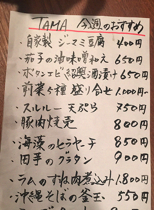 В Токио есть два домашних и уютных ресторана Tama. Найти первый просто так не получится: он расположен на нижнем этаже обычного торгового центра по адресу: 2-6-1 Marunouchi Chiyoda-ku. Обычно ничего не ожидаешь от ресторанов в моллах, но в Токио это совсем другая история. Второй находится в Шибуе, а точнее: 2-3-2 Shibuya, Shibuya-ku. Tama сочетают окинавскую (Окинава — остров на юге Японии) и китайскую кухни, и это очень удачный кулинарный микс.