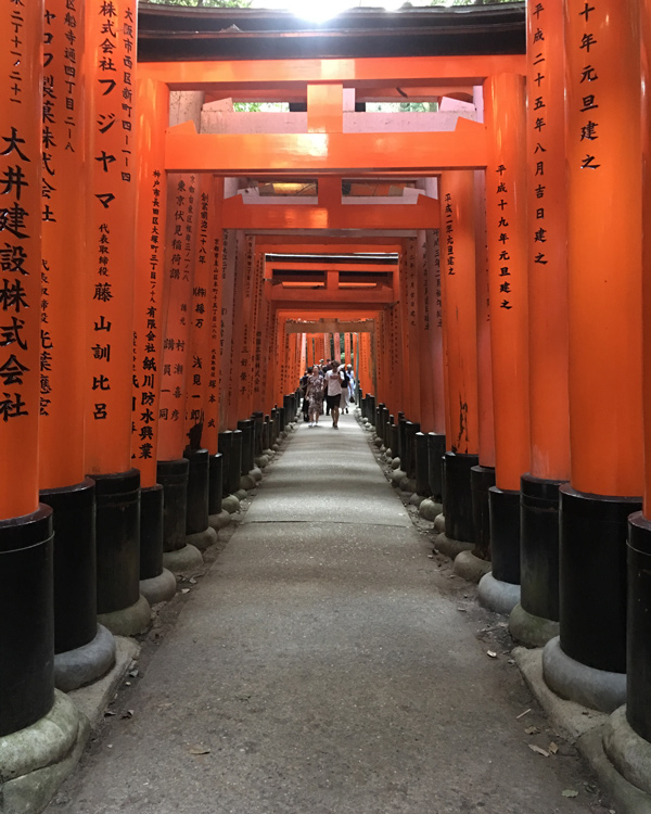 Когда мы начали спускаться вниз к городу, оранжевые арки развернулись к нам обратной стороной, исписанной черными графичными иероглифами. Туда ты идешь и видишь только яркие арки, а на обратном пути — что-то новое. Мы не знаем, что там написано, но мой молодой человек сравнил это пространство с самой жизнью: сначала ты проходишь нелегкий путь, преодолеваешь трудности, растешь, идешь дальше вперед и по пути задаешь вселенной вопросы, а когда достигаешь какого-то пика, наконец, получаешь на них ответы. И эти письмена на воротах — ответы. Он так это воспринял, и мне это понравилось.