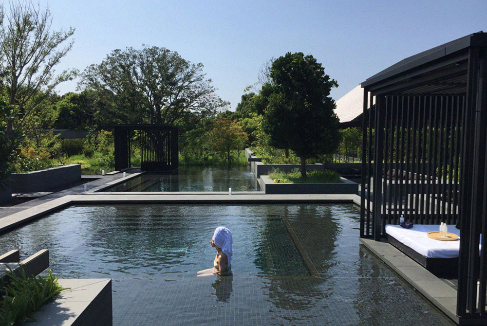 Япония славится своими горячими источниками, и, несмотря на август и страшную жару, мы отправились к ним. У отеля Aman есть свой спа-курорт, который называется Amanemu и расположен неподалеку от залива Аго. Меня поразило, до какого совершенства в этом пространстве доведена минималистичная красота во всем: в убранстве интерьеров, в ландшафтном дизайне, даже в японских сандалиях гэта, которые выдают каждому гостю. Буквально каждый камушек в саду лежит именно так, как надо. Там мы катались на велосипедах, ездили на дикий пляж, купались. Причем пляж был настолько дикий, что я даже не понимаю, зачем туда полезла. Спускаться по камням к воде было неприятно, там кишели какие-то таракашки. Но вода была прекрасна. И всё было очень романтично. В горячих источниках мы тоже отважились полежать — в воде, температура которой около 60 градусов. Но туда можно прийти и ночью, будет более комфортно.