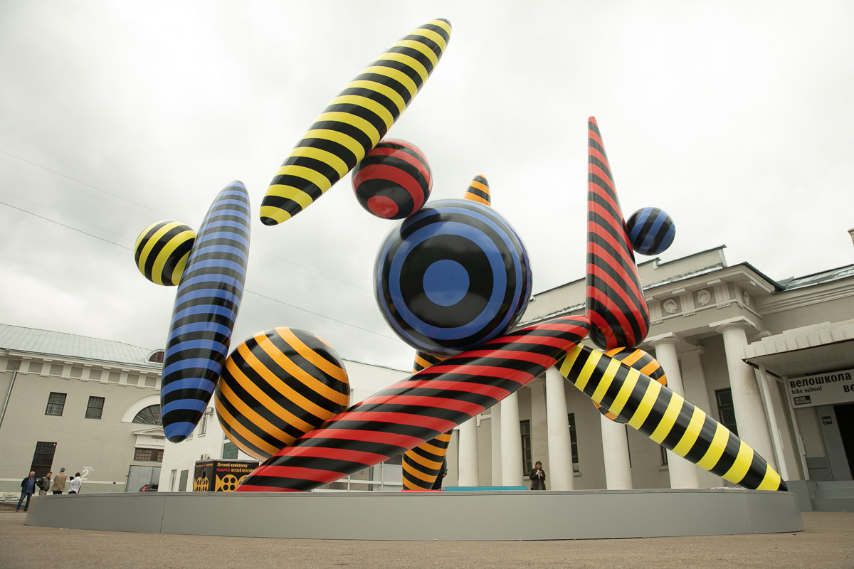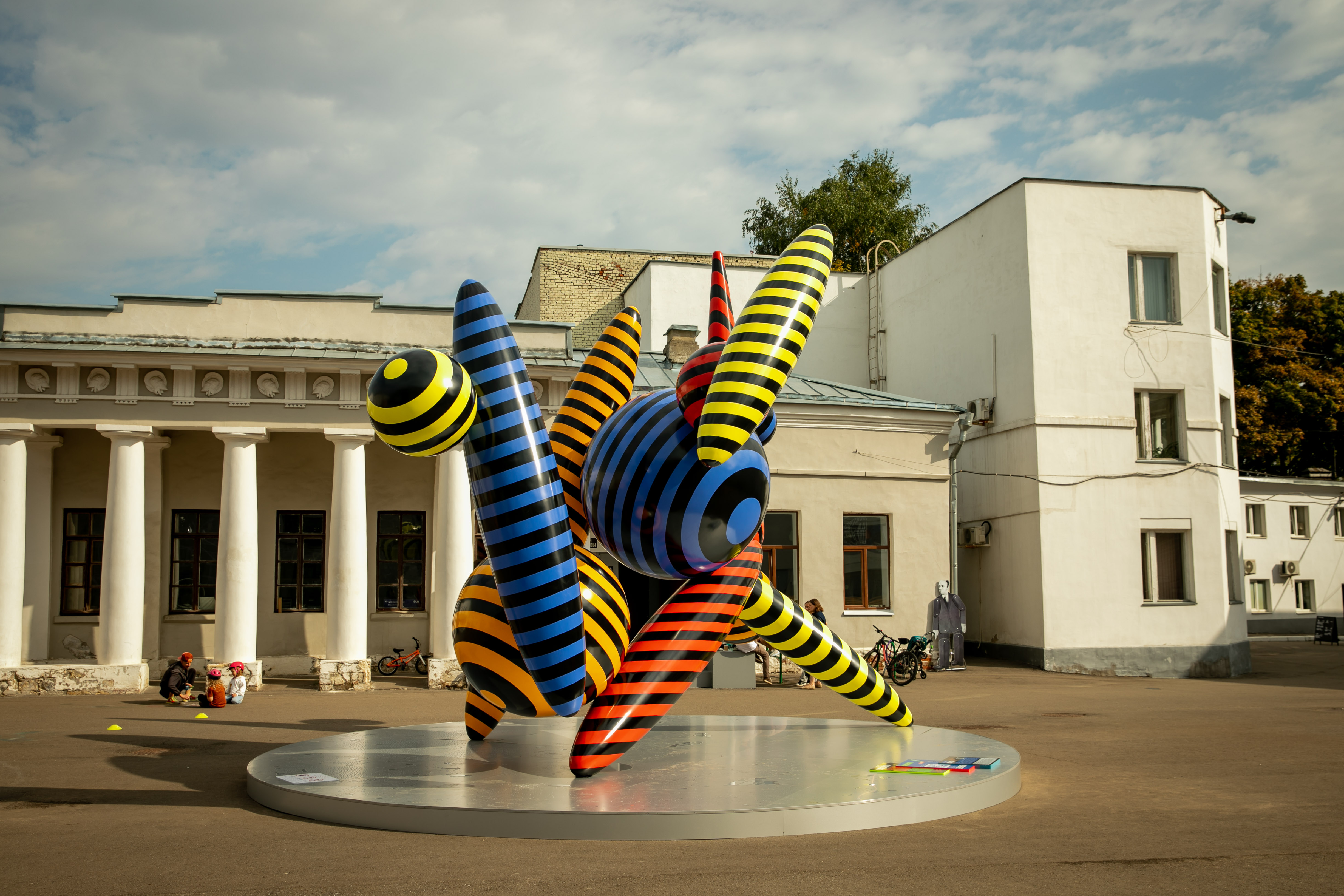 Изначально художник и скульптор Роман Ермаков, чья белая скульптура совсем недавно приковывала внимание гуляющих недалеко от Кремля, задумывал украсить Москву 29 разными объектами. Гладкие блестящие скульптуры — посетители из неведомого пятого измерения, в котором давление и устойчивость цвета и формы просто не существуют, так что царит полный хаос, но и полная свобода. В проекте «Здесь и сейчас» Ермакову удалось приоткрыть один такой портал и все же выпустить во двор Музея Москвы немного хаоса (хотя его и так немало в неспокойном сентябрьском мегаполисе). В трехмерном столичном пространстве текучие энергии из других миров тут же замерли, чтобы мы могли разглядеть их во всей пестрой красоте.