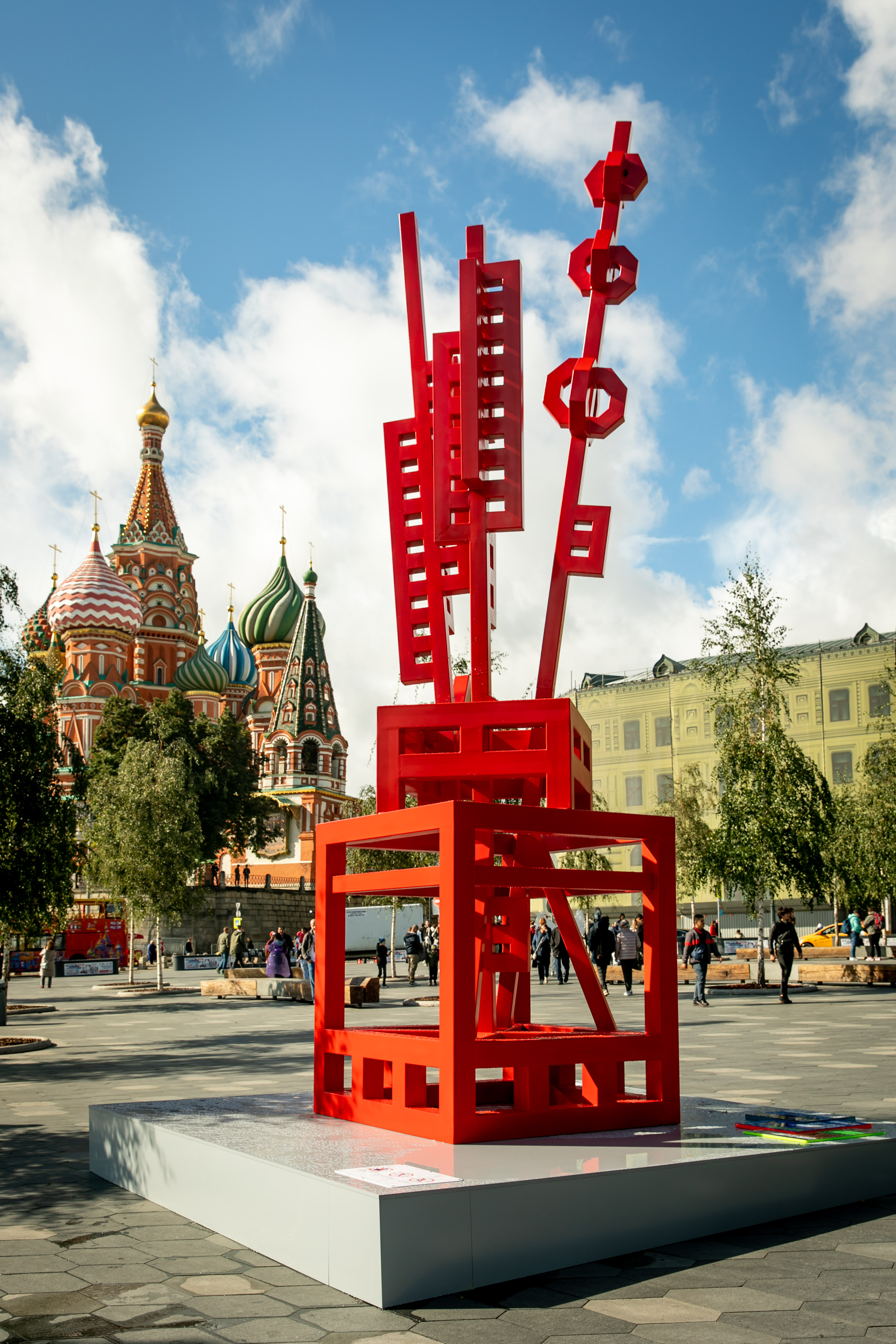 Еще будучи в училище, прославленный скульптор-нонконформист Юрий Шелковский начал собирать альбомы и издания по китайскому искусству, находя в простоте Востока куда больше поэзии, чем в работах европейских художников. Форма мысли воплощалась в пластике, и появлялись сюжеты скульптур, у которых оставался только контур, «вылепленный» из реек. Художник делится, что сюжет «Вазы с цветами» появился еще в начале 1970-х годов, а вот в новом проекте красный букет впервые разросся до таких больших размеров. Семиметровая алая скульптура, сваренная из металла, привнесла заметный супрематический след в пространство парка «Зарядье».