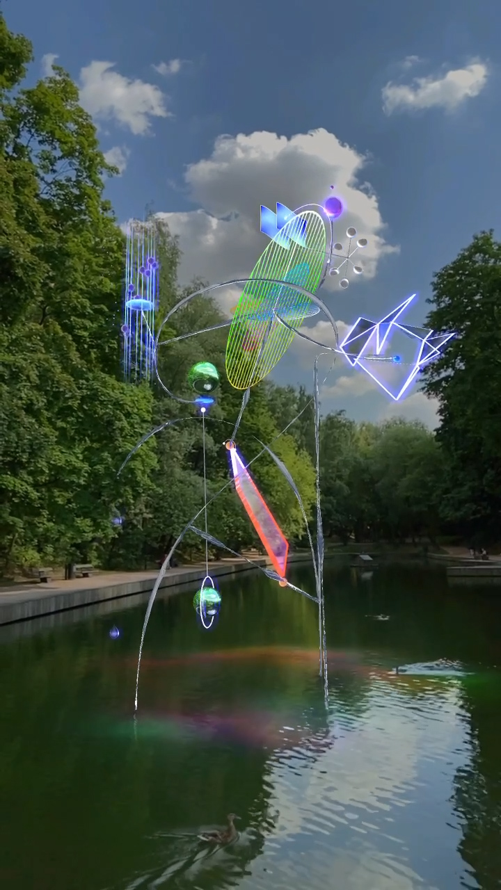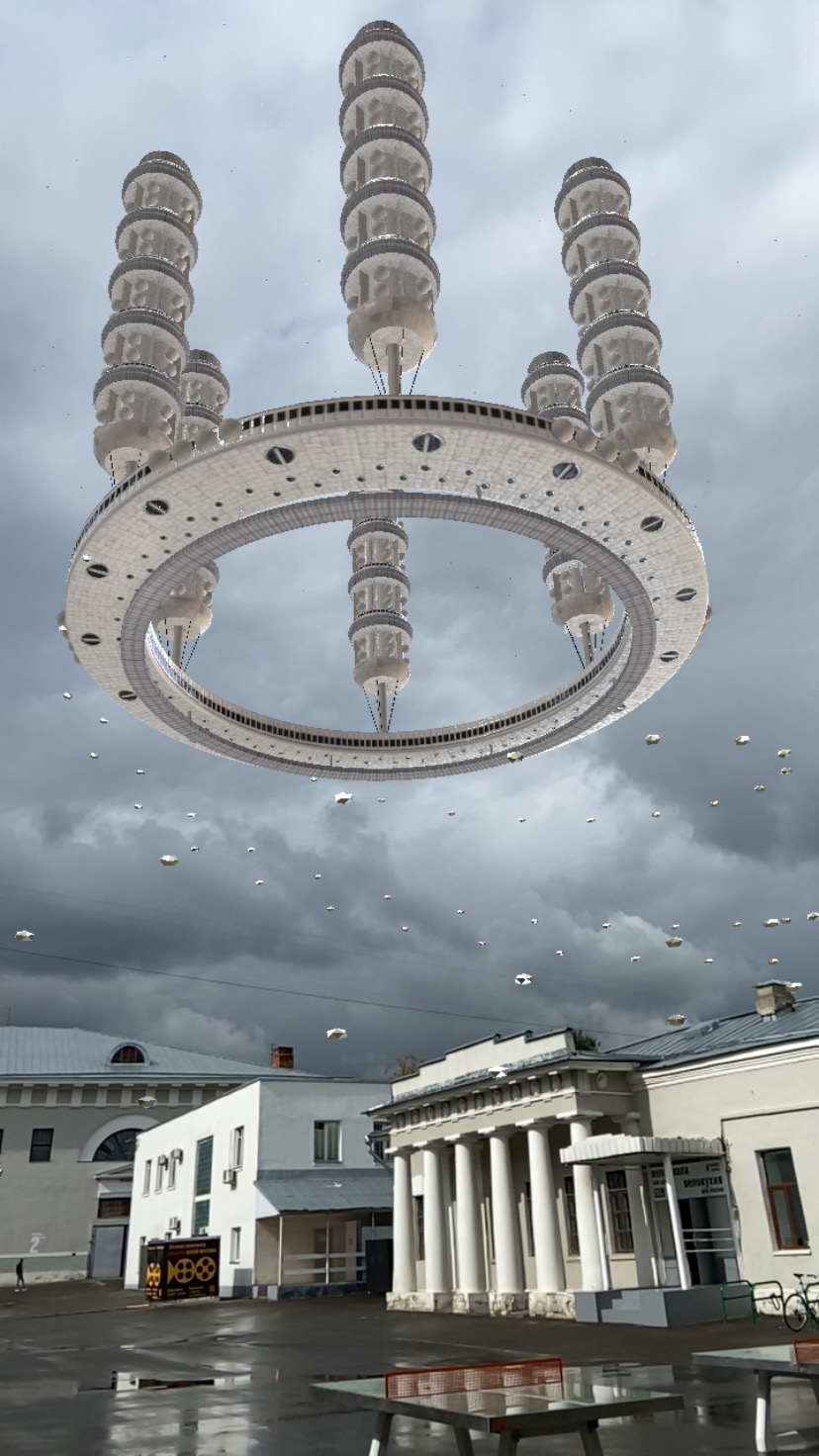 Одно из новаторских решений «Здесь и сейчас» этого года — представление объектов дополненной реальности и AR как произведений паблик-арта. Они привязаны к локациям, для которых создавались художниками, а открыть их можно с помощью камеры Instagram. Команда мультимедийной студии «Силы света» вдохновлялась концепцией, которая берет истоки в дипломной работе советского архитектора Георгия Крутикова 1928 года, сенсационной для того времени. Крутиков заботился о будущем планеты, а потому предлагал перенести жилые дома в воздушное пространство, а на земной поверхности оставить только зоны для работы и отдыха. Отсканировав QR стеллы во дворе Музея Москвы, можно поразглядывать парящие здания, похожие на НЛО, а вот додумывание интерьеров виртуальных домов-коммун создатели оставили фантазии зрителей.