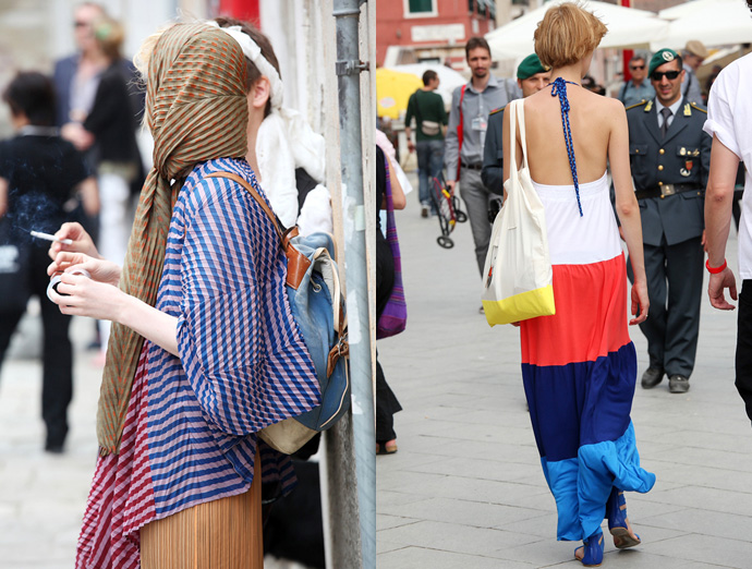 Если отвлечься от искусства, то в Венеции поражает даже то, как одеваются люди. Во-первых, они почти не носят каблуки из-за брусчатки и других особенностей передвижения по городу. Во-вторых, они не гоняются за тенденциями и вещами сезона, как в период недель моды. Могут носить одежду из прошлых сезонов, необычно миксуют вещи. Мода во время биеннале какая-то интеллектуальная, одежда подчеркивает внутреннее состояние человека, отражает его принадлежность к искусству.