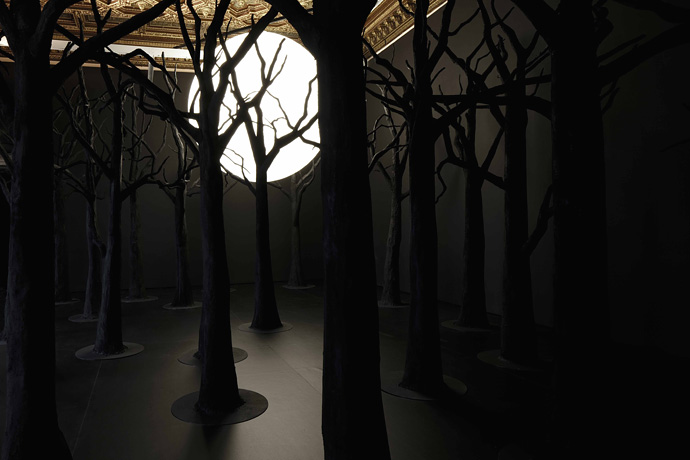 В Палаццо Грасси (Palazzo Grassi), на традиционной площадке Пино, проходит выставка The World Belongs to You. В одной из комнат палаццо меня поразила инсталляция Gunpowder Forest Bubble молодого французского художника Лориса Грео (Loris Gréaud). В черной-черной комнате стоят черные голые деревья, напоминающие ночной лес, и только огромный шар излучает мягкий имитирующий лунный свет.