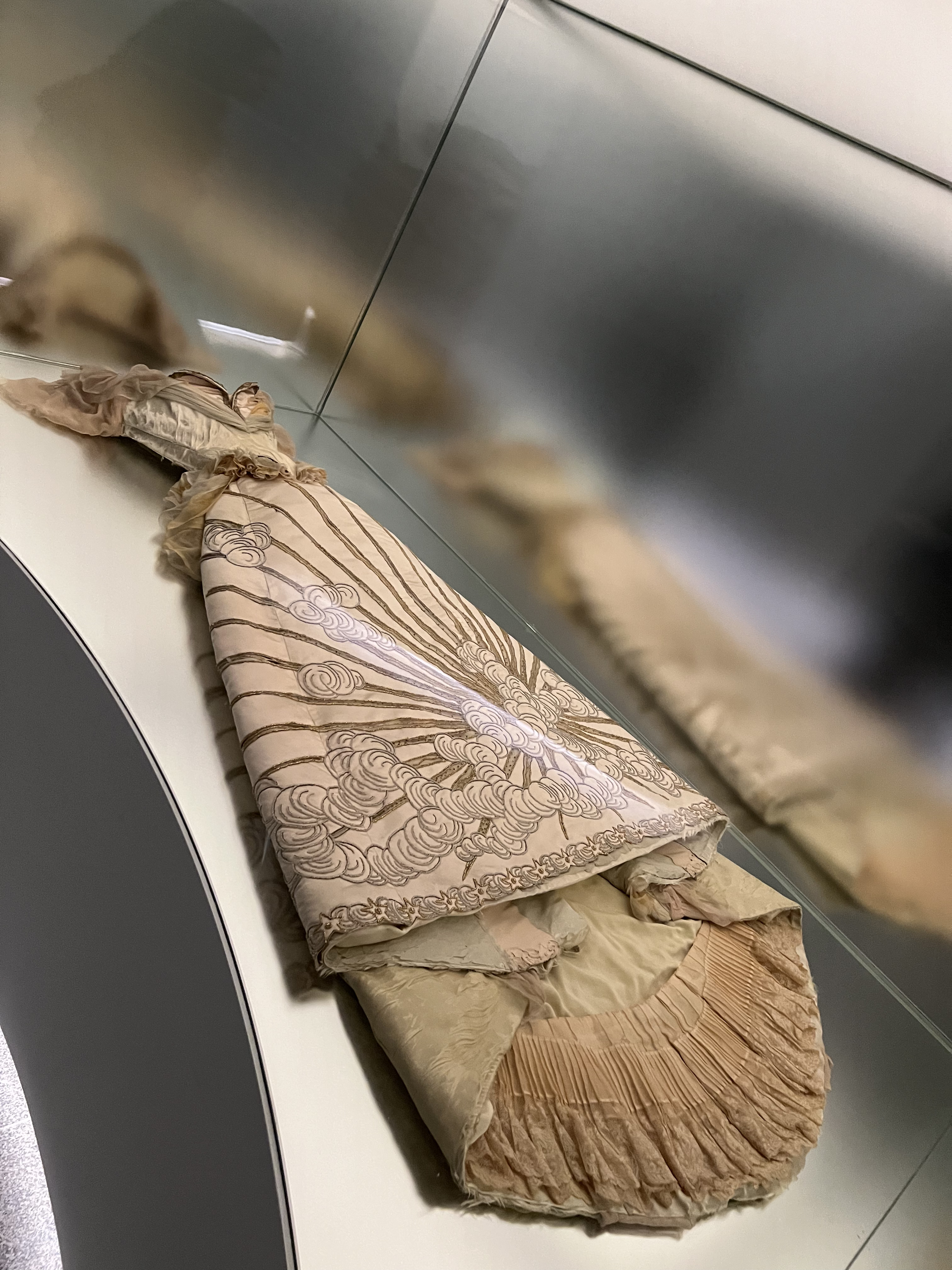 Плащ из черного шелкового атласа с узором в виде тюльпанов с хлопковым кружевом и золотистыми шелковыми кистями изготовлен Чарльзом Фредериком Уортом из ткани под названием Tulipes Hollandaises, которая была представлена на Всемирной выставке в Париже в 1889 году. В то время материал был одним из самых дорогих в производстве из-за уникальной длины основного рисунка — около 1 метра.