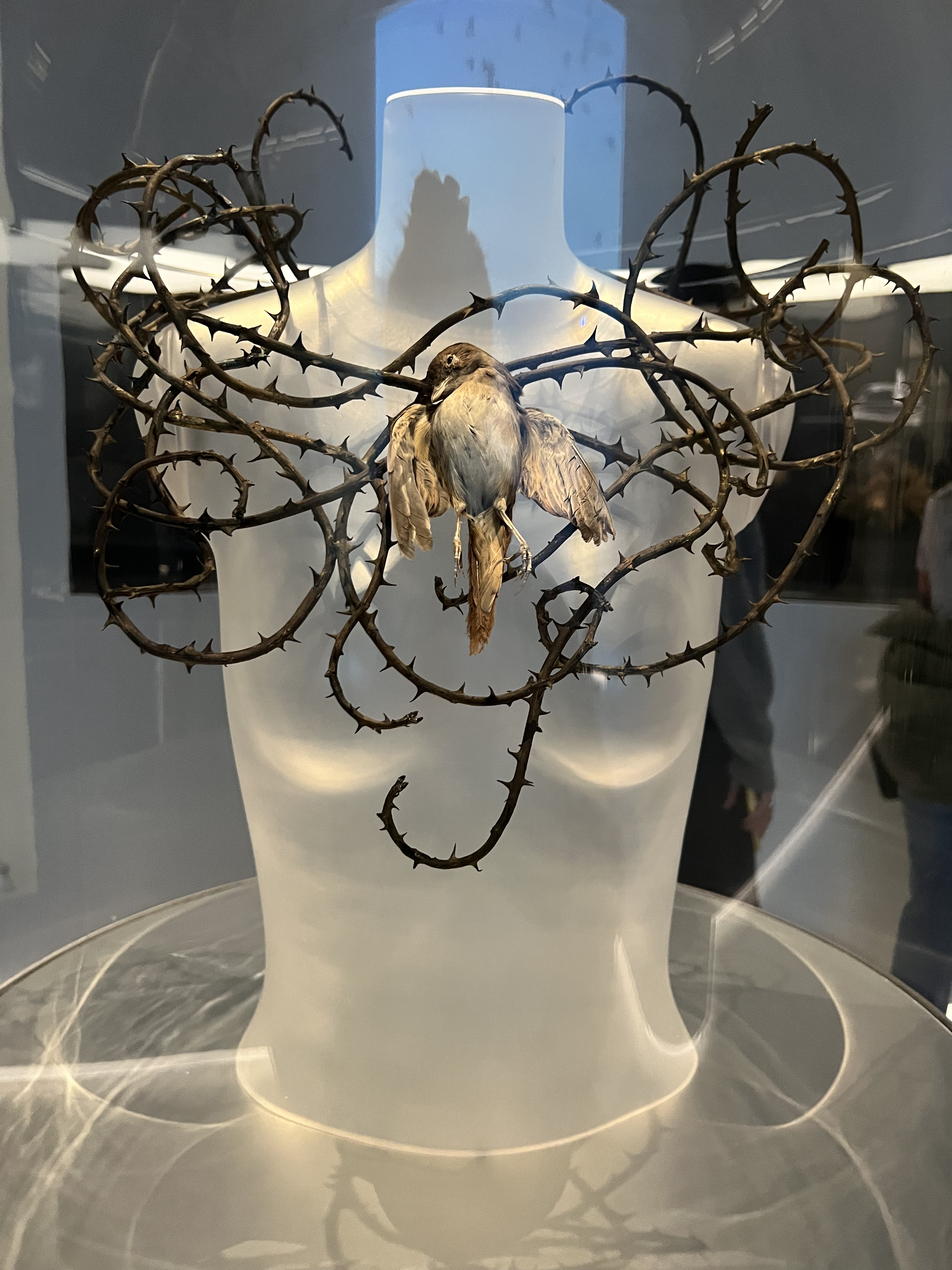 Птицы были не только музами, но и жертвами моды. В конце XIX века шляпы, украшенные чучелами птиц, пользовались такой популярностью, что служили причиной ежегодной гибели сотен тысяч птиц. Символом этой жертвы стало латунное колье с чучелом воробья авторства Саймона Костина под названием «Соловей и роза». Одноименная сказка Оскара Уайльда звучит в галерее THE NIGHTINGALE AND THE ROSE (Соловей и роза) в исполнении Элизабет Дебики. А дополняет мрачную атмосферу витрина со шляпами, декорированными чучелами птиц и датированными концом XIX – началом XX века, когда активизм защитников природы положил конец тому жестокому тренду. На рентгеновских снимках шляп видны все их составляющие: птичьи скелеты, проволока, стеклянные бусины и набивка чучел, использованная таксидермистами.