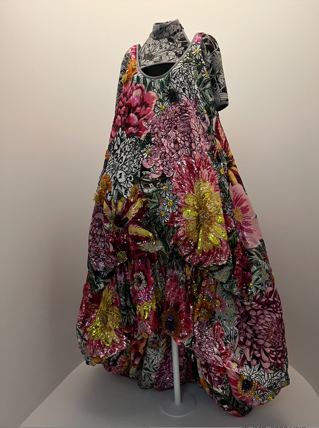 Платье Digitalis из коллекции Mary Katrantzou весна-лето 2008 в открывающем выставку цветочном коридоре PAINTED FLOWERS (Цветочные узоры) декорировано цифровым принтом с лилиями, ромашками, георгинами, пионами и хризантемами, расшитыми блестками, бусинами и стеклярусом. Палитрой и геометрией узор напоминает расположенные здесь же исторические бальные платья: французское 1740-х годов и английское из 1780-х (флора была самым популярным декором в моде того периода). Однако дизайнерское вдохновение Катрантзу более современно — его выдает имитация раскраски по номерам.