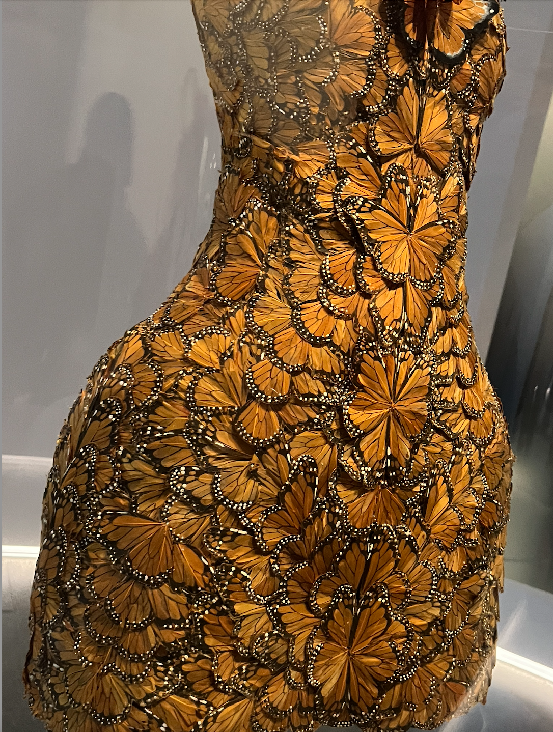 Бабочка — пожалуй, самая универсальная метафора жизненного цикла: переход от гусеницы к куколке и бабочке образно воплощает жизнь, смерть и возрождение. Поэтому в центре под стеклянным куполом в зале BUTTERFLIES (Бабочки) находится одноименное платье из дебютной коллекции Сары Бертон для Alexander McQueen, которую показали осенью 2010 года, спустя 8 месяцев после смерти наставника и основателя Ли Маккуина. Несмотря на иллюзию, основа из шелковой органзы покрыта не выпущенными бабочками, а аппликацией из оранжевых, черных и белых перьев. Они вырезаны, раскрашены и расположены так, чтобы имитировать культовый узор на крыльях бабочки-монарха, символизирующей оптимизм, стойкость и выносливость. В этих качествах бабочке не откажешь — ежегодно она мигрирует на расстояние более 5 тысяч километров.