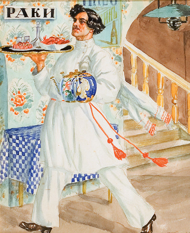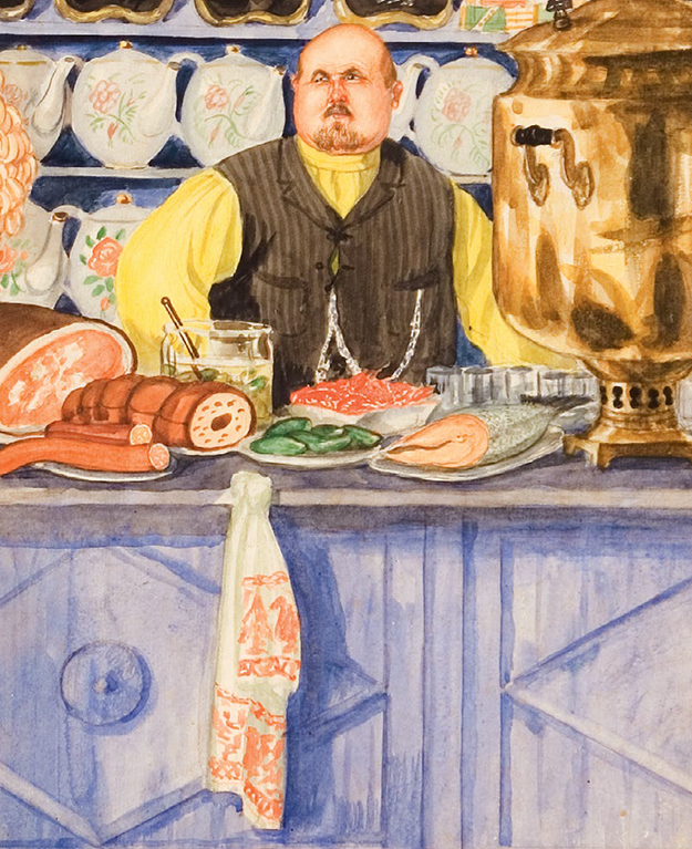 Обедает купец в трактире, там можно заказать расстегай, икру, рыбную селянку, жареного поросенка, гурьевскую кашу и другую снедь. Как говорит знаменитый трактирщик Тестов: «У меня этих разных фоли-жоли да фрикасе-курасе не полагается... По-русски едим — зато брюхо не болит, по докторам не мечемся, полоскаться по заграницам не шатаемся». В трактире можно еще и решать деловые вопросы, а также слушать хор, подпевать ему или петь, что сердце пожелает, и не стесняться в выражениях — женщин в трактир все равно не допускают. Кстати, здесь официантов зовут половыми.