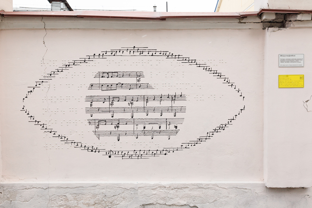 Арт-объект для незрячих состоит из трех историй известных слабовидящих людей: музыканта Рэя Чарльза, изобретателя Михаила Пожидаева и бегуньи Марлы Раньян. Рисунки и надписи нанесли шрифтом Брайля и подстроили под текстуру покрытия.