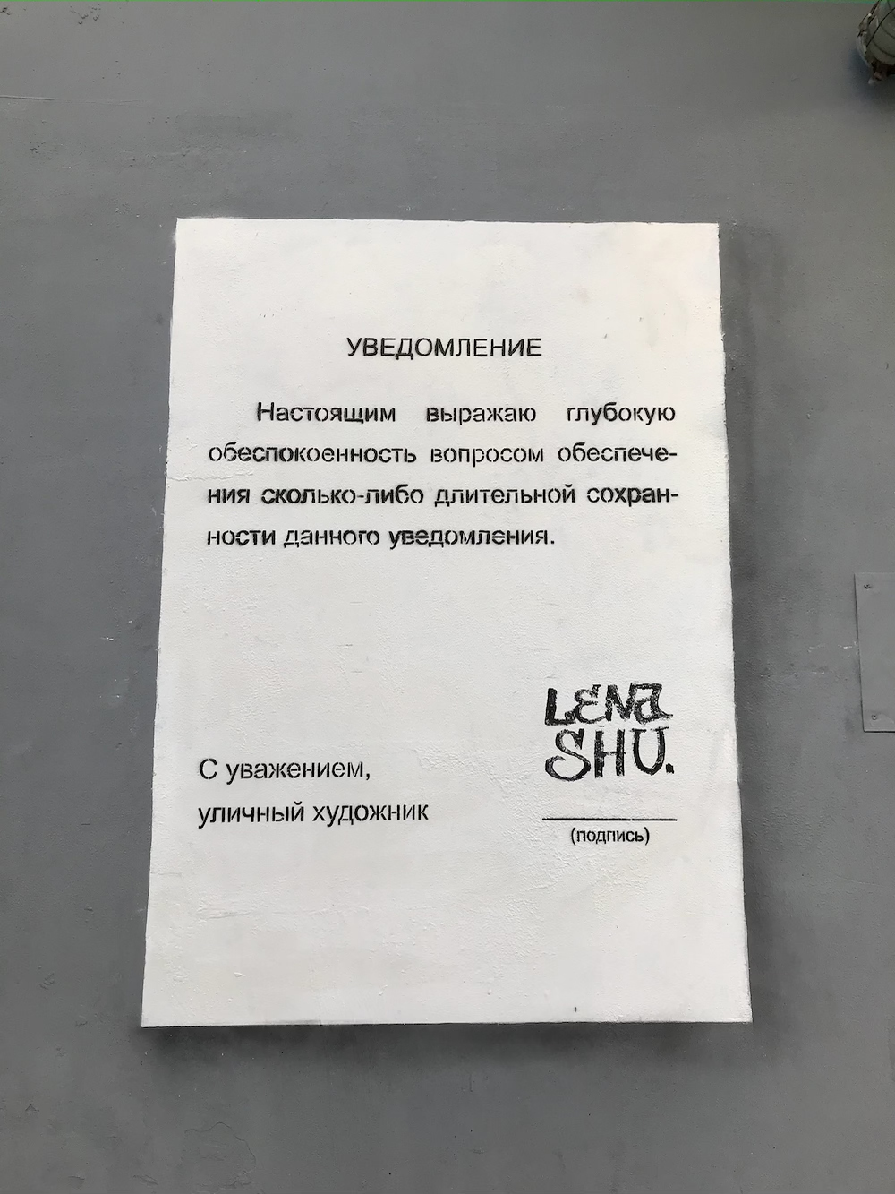 Физически работа исчезла при ремонте дома на Сакко и Ванцетти, 55, распался дуэт создателей стены, но искусство живет в клипе «Екатеринбюргер» уральской рок-группы «Курара». Организаторы STENOGRAFFIA отмечают, что со временем стали систематизировать информацию об арт-объектах, вести фотофиксацию и заниматься их реставрацией.