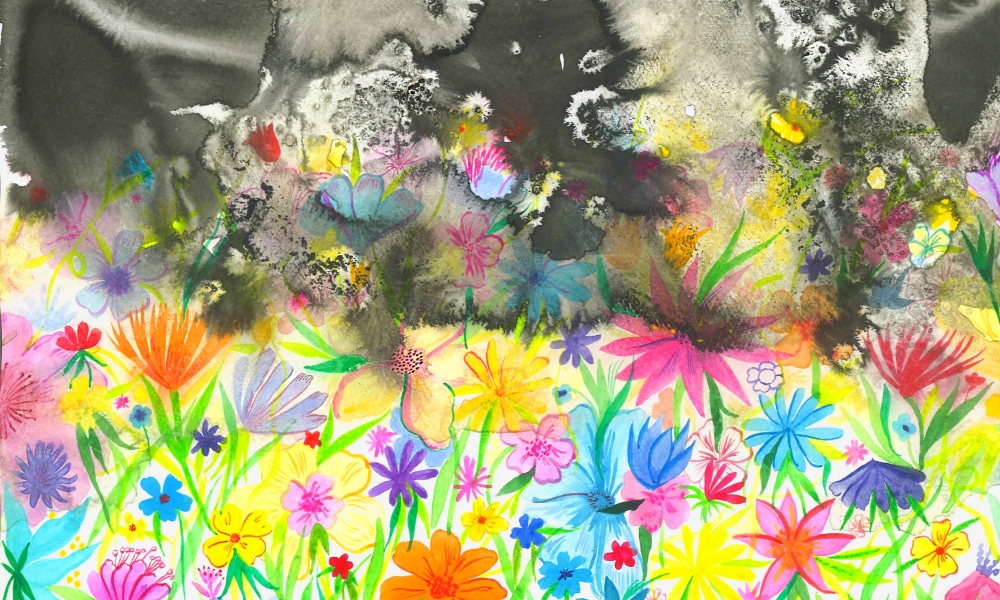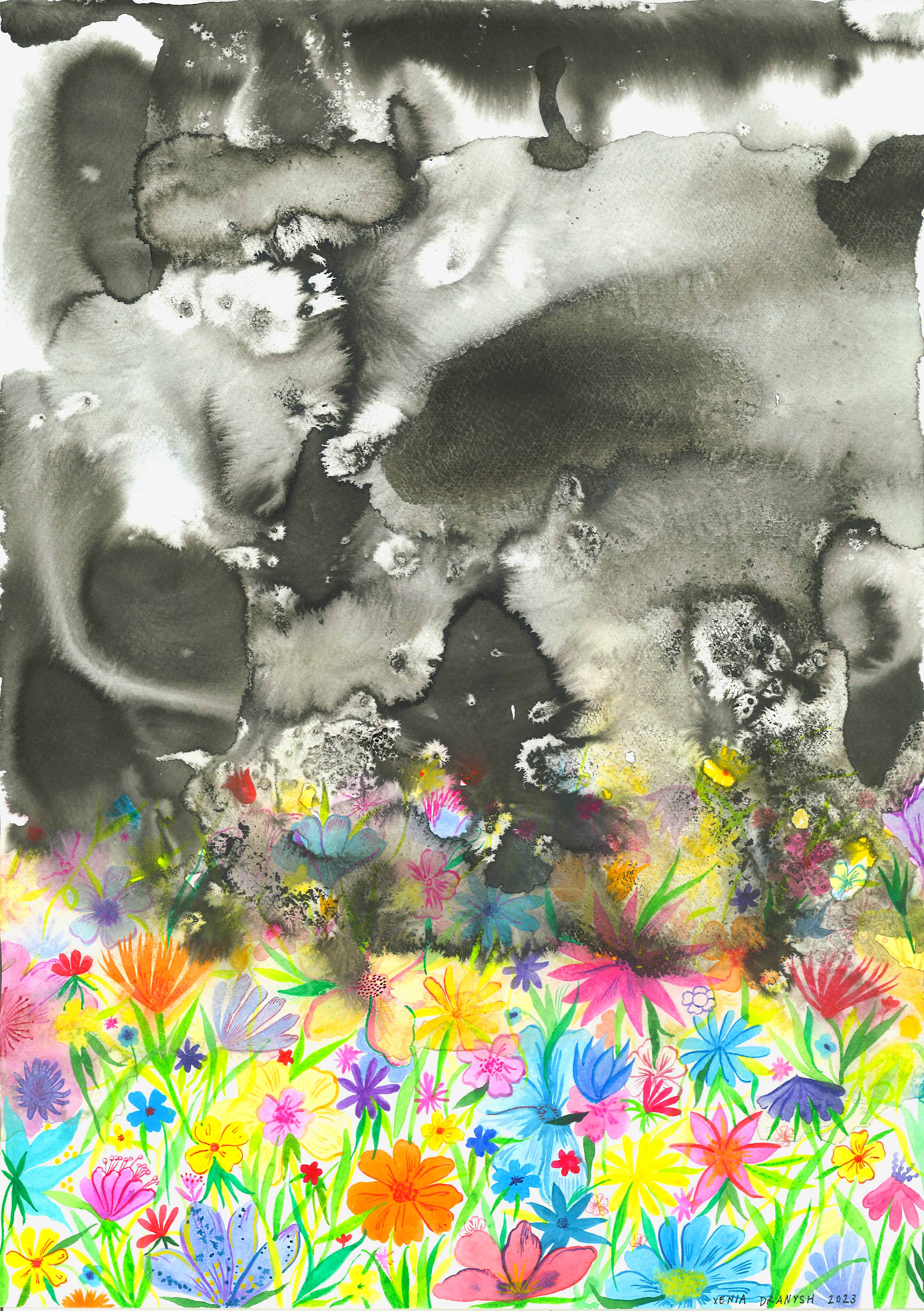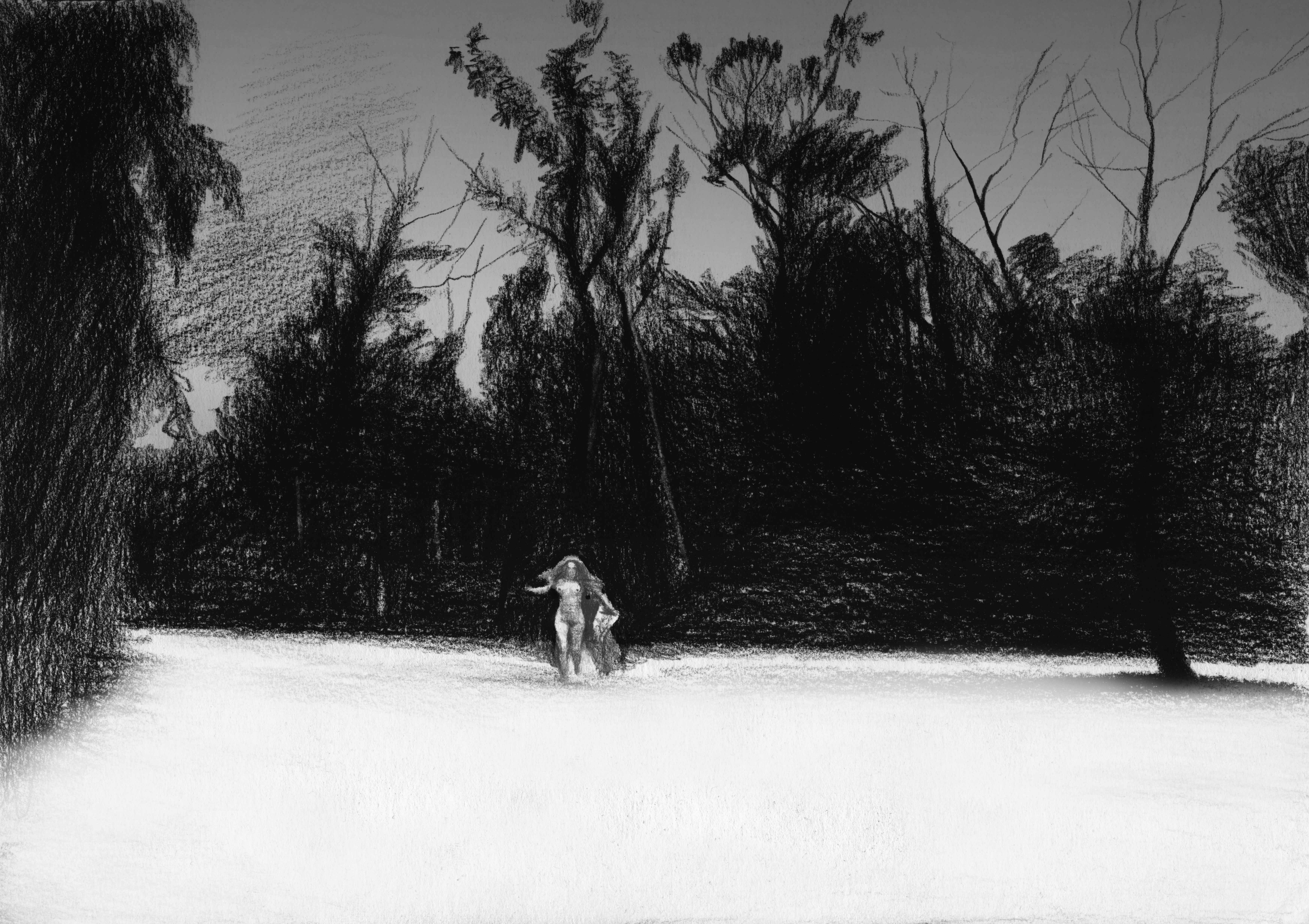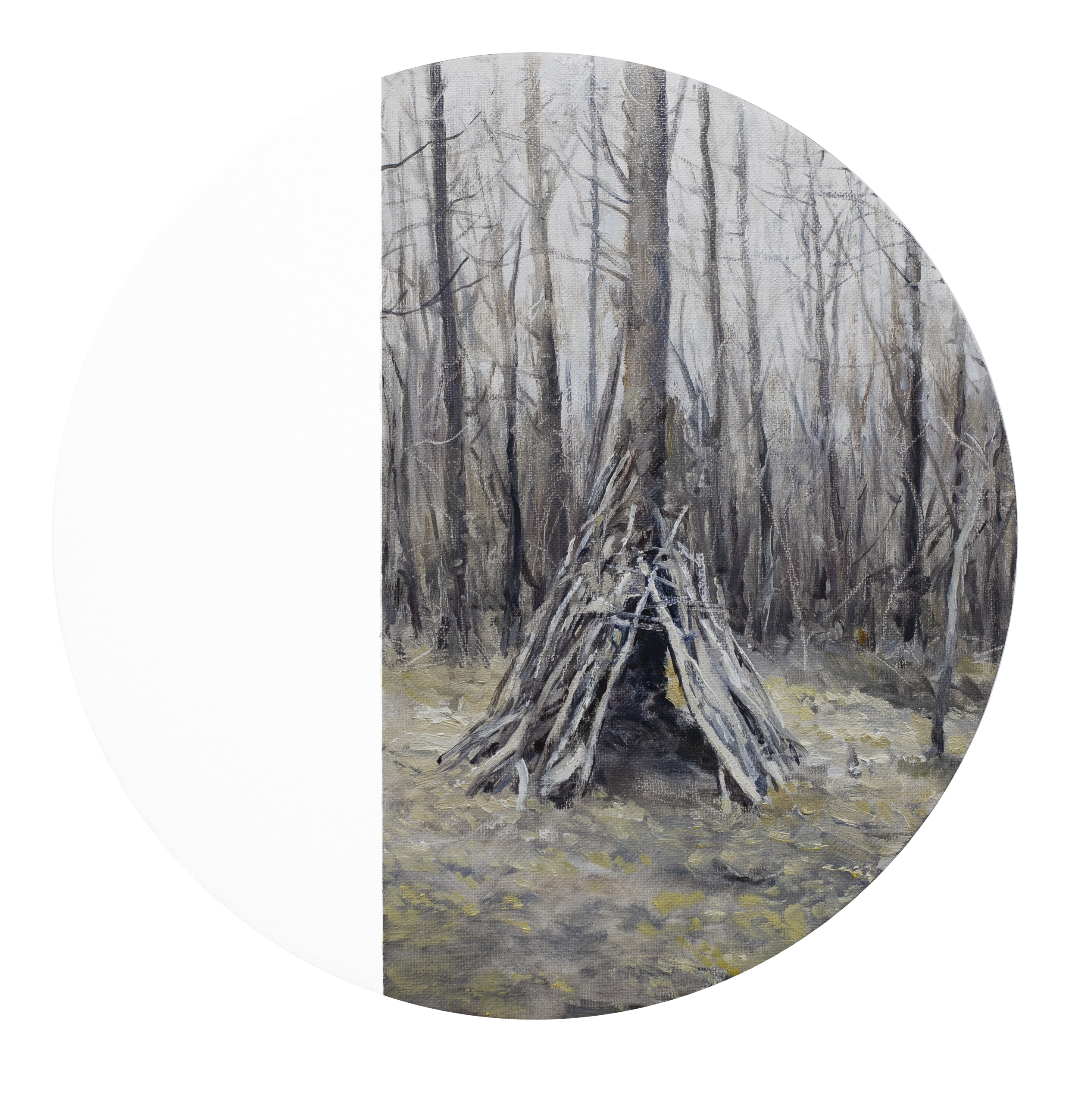 В голом постапокалиптическом лесу кто-то выстроил хлипкое убежище. Но на него уже зловеще надвигается белая, как туман, часть холста.