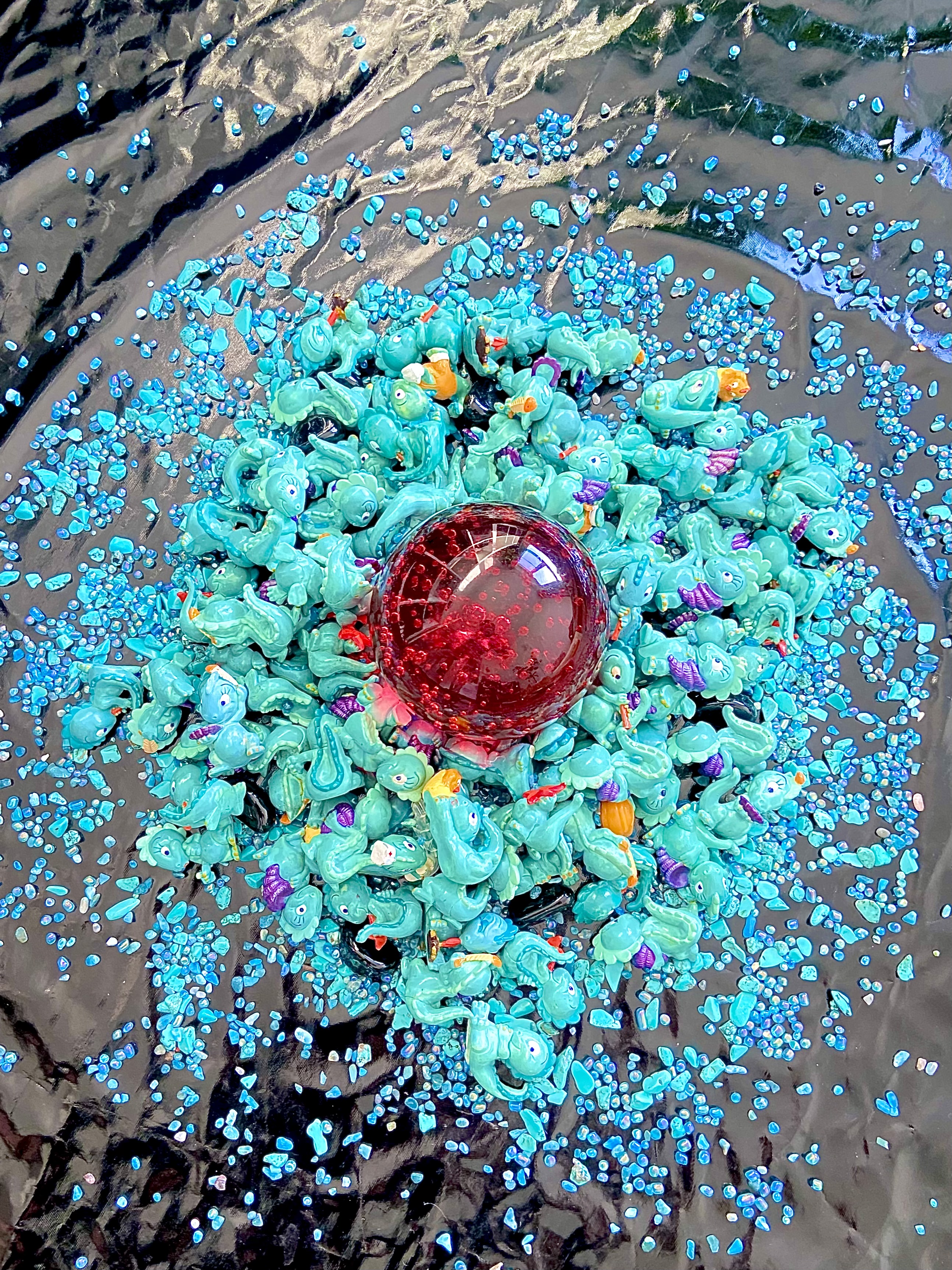 Сюжет гибели динозавров от астероида трактован с использованием бусин и фигурок из «Киндер-сюрприза». А может, перед нами апокалипсис безудержного производства и потребления безделушек?