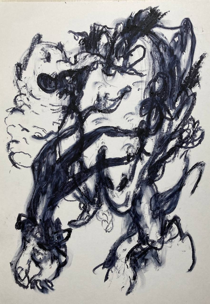 В полуабстрактной, хаотичной композиции в духе Франсиско Гойи или Василия Чекрыгина угадывается борьба чудищ, разрывающих общую жертву.