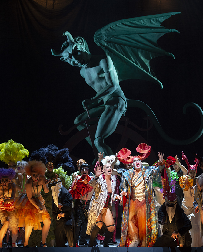 Эвридика жутко устала от Орфея и готова свалить от него хоть к Плутону в ад, а Орфей вынужден идти за ней не потому, что любит, а потому что Общественное Мнение (которому назначен отдельный персонаж) может осудить мужа, который не бежит за неверной женой. Во втором акте Юпитер в образе мухи в дичайшем костюме проникает в будуар новой адской императрицы, чтобы ее соблазнить. Дело заканчивается тем, что Юпитер в углу занимается прицепленным к своему костюму плюшевым членом, а Эвридика в своем углу занимается тем же, но с собой. После завершения перформанса Эвридика триумфально прицепляет член к себе и объявляет: она не хочет быть ни с Плутоном, ни с Юпитером, ни тем более с законным мужем, а хочет тусоваться с Бахусом, пить вино и хохотать.