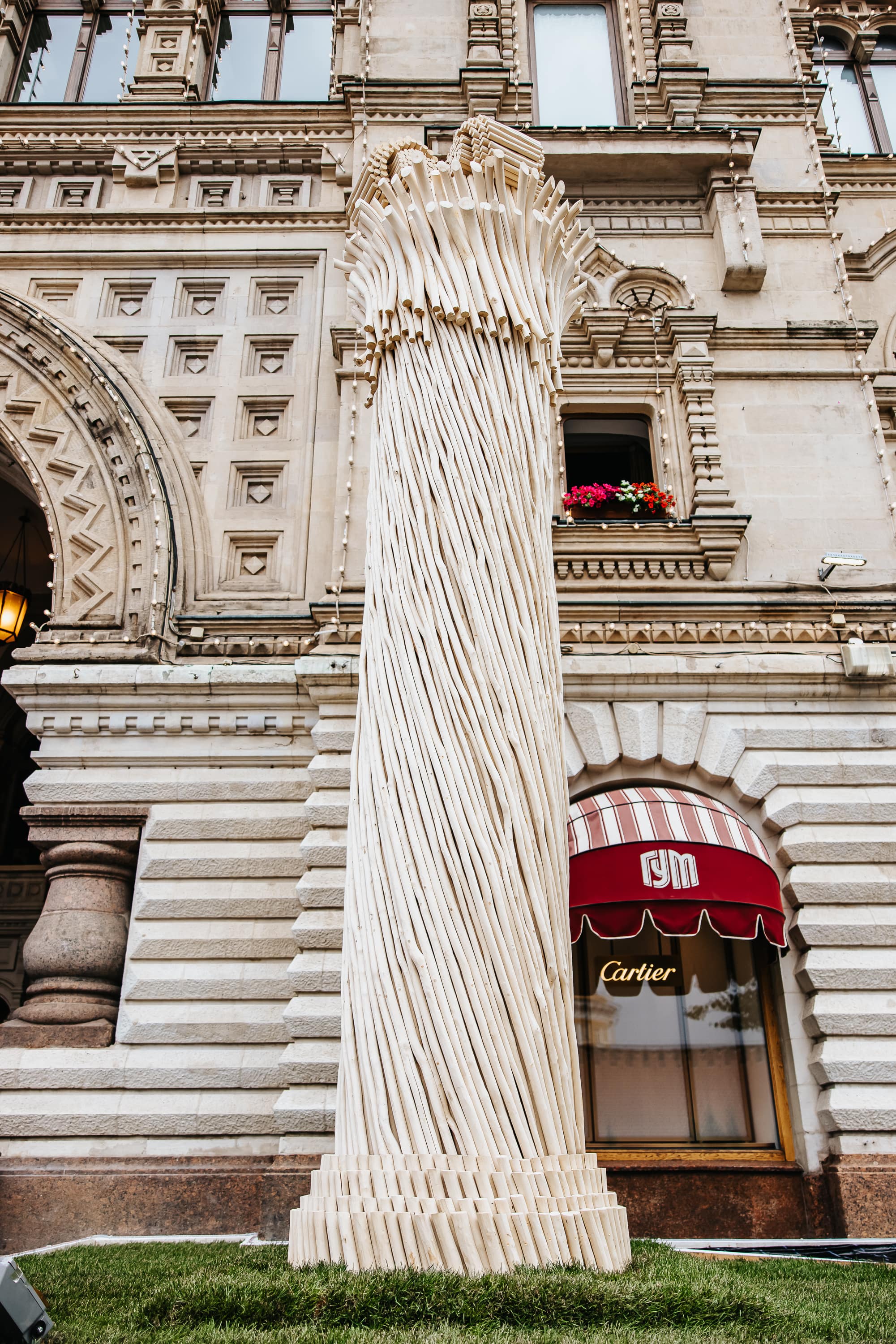 В новой серии «Русская античность» я фактически копирую античную колонну, но из деревенского русского материала: каннелюры, капитель, база, лещина. На выставке представлена скульптура «Колонна» — шестиметровая, совершенно полноценная колонна в духе русской античности. Мы делали колонну около двух месяцев, а шел я к этому 20 лет.
