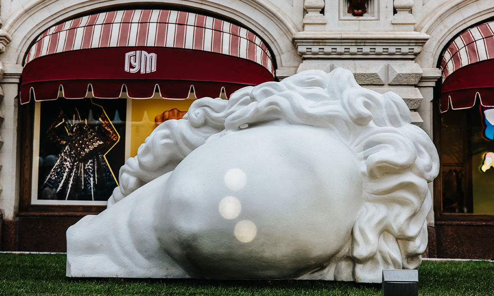 Работа «Большая античная голова» — о проникновении новой эстетики, вызванной взрывным развитием информационных технологий, в традиционное эстетическое пространство. Производство объекта заняло 4 месяца.