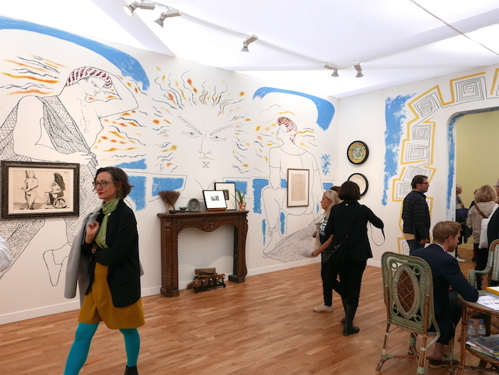 Популярны объекты художницы Лор Прово, представившей в этом году Французский павильон на Венецианской биеннале. Инсталляция из стульев (15 000 евро) и лампы (40 000 евро) представляет галерея Lisson, гобелен — от галереи Nathalie Obadia.